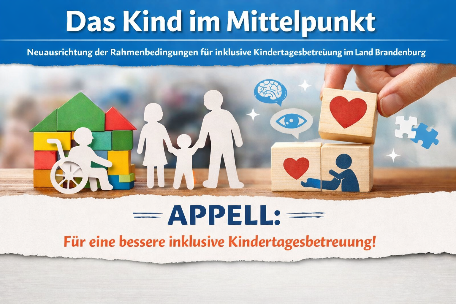 Der Arbeitskreis Frühförderung der Stadt Cottbus/Chóśebuz hat einen Appell zur Neuausrichtung der Rahmenbedingungen für inklusive Kindertagesbetreuung veröffentlicht. Ziel ist es, die aktuellen Regelungen stärker an den tatsächlichen Bedarfen von Kindern mit (drohenden) Beeinträchtigungen auszurichten und Teilhabe von Anfang an zu sichern.