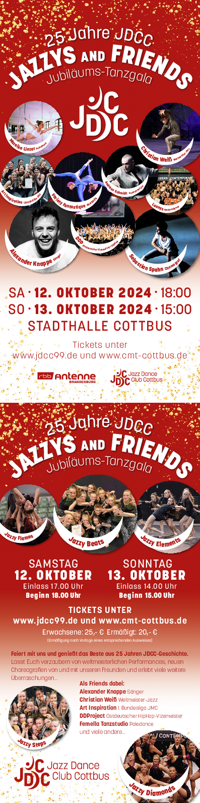 Anlässlich des 25-jährigen Bestehens veranstaltet der JDCC 99 e.V. am 12. und 13. Oktober 2024 in der Cottbuser Stadthalle eine große Jubiläums-Tanzgala unter dem Titel „Jazzys & Friends“. Mit rund 140 tanzenden Mitgliedern und zahlreichen lokalen Künstlern und Künstlerinnen verwandeln alle Beteiligten die Stadthalle in eine spektakuläre Tanzbühne, auf der das Beste aus 25 Jahren Vereinsgeschichte präsentiert wird. Weltmeisterliche Performances, einzigartige Choreografien und überraschende Gastauftritte von Künstlern wie Alexander Knappe und dem Femella Tanzstudio machen diesen Abend zu einem unvergesslichen Erlebnis. Die Tanzgala bietet den Vereinsmitgliedern nicht nur die Möglichkeit, ihre neuen Choreografien vorzustellen, sondern fördert auch den Austausch mit anderen Tanzsportarten und sichert das hohe Leistungsniveau unserer Turnierformationen.