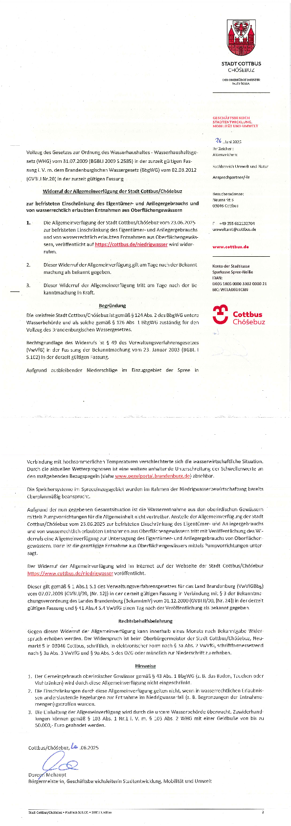 1. Die Allgemeinverfügung der Stadt Cottbus/Chóśebuz vom 23.06.2025 zur befristeten Einschränkung des Eigentümer- und Anliegergebrauchs und von wasserrechtlich erlaubten Entnahmen aus Oberflächengewässern, veröffentlicht auf https://backup.neucottbus.de/niedrigwasser wird widerrufen.