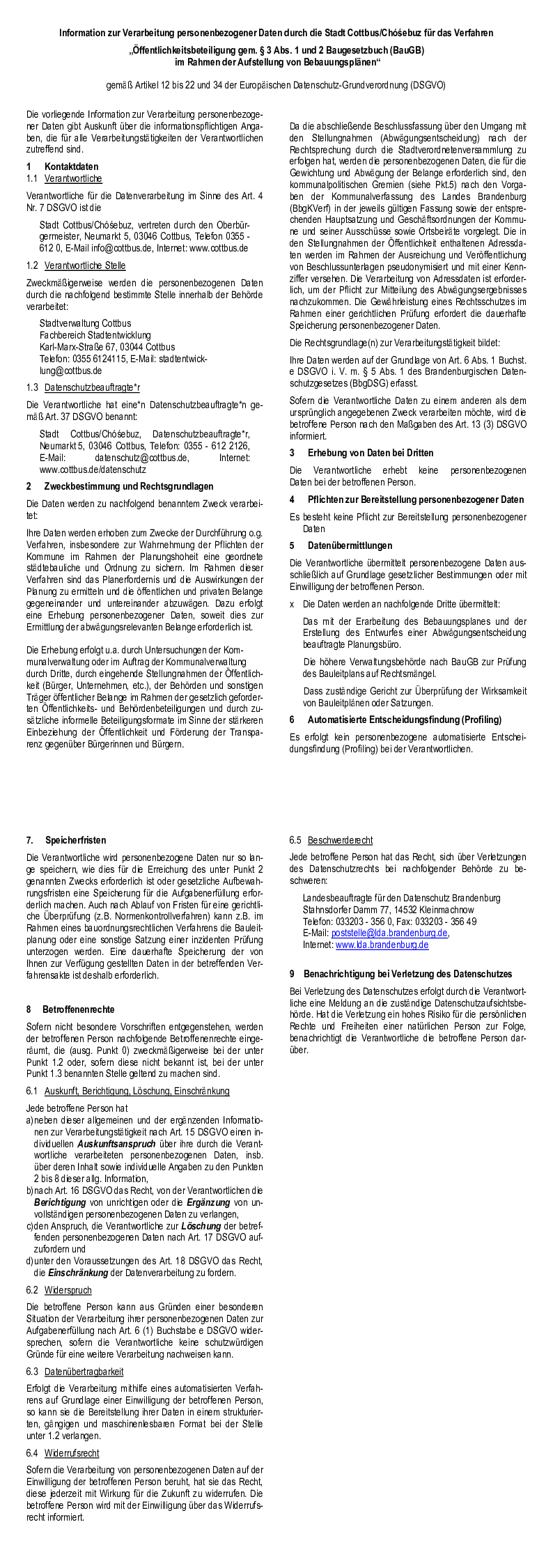 Weitere Informationen entnehmen Sie bitte dem Formblatt Informationspflichten bei der Erhebung von Daten im Rahmen der Öffentlichkeitsbeteiligung nach BauGB (Art. 13 DSGVO), welches mit im Internet veröffentlicht wird.