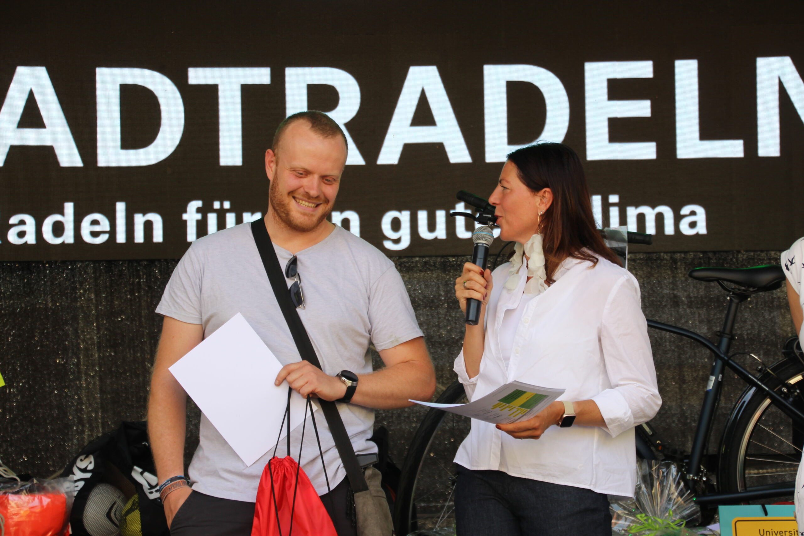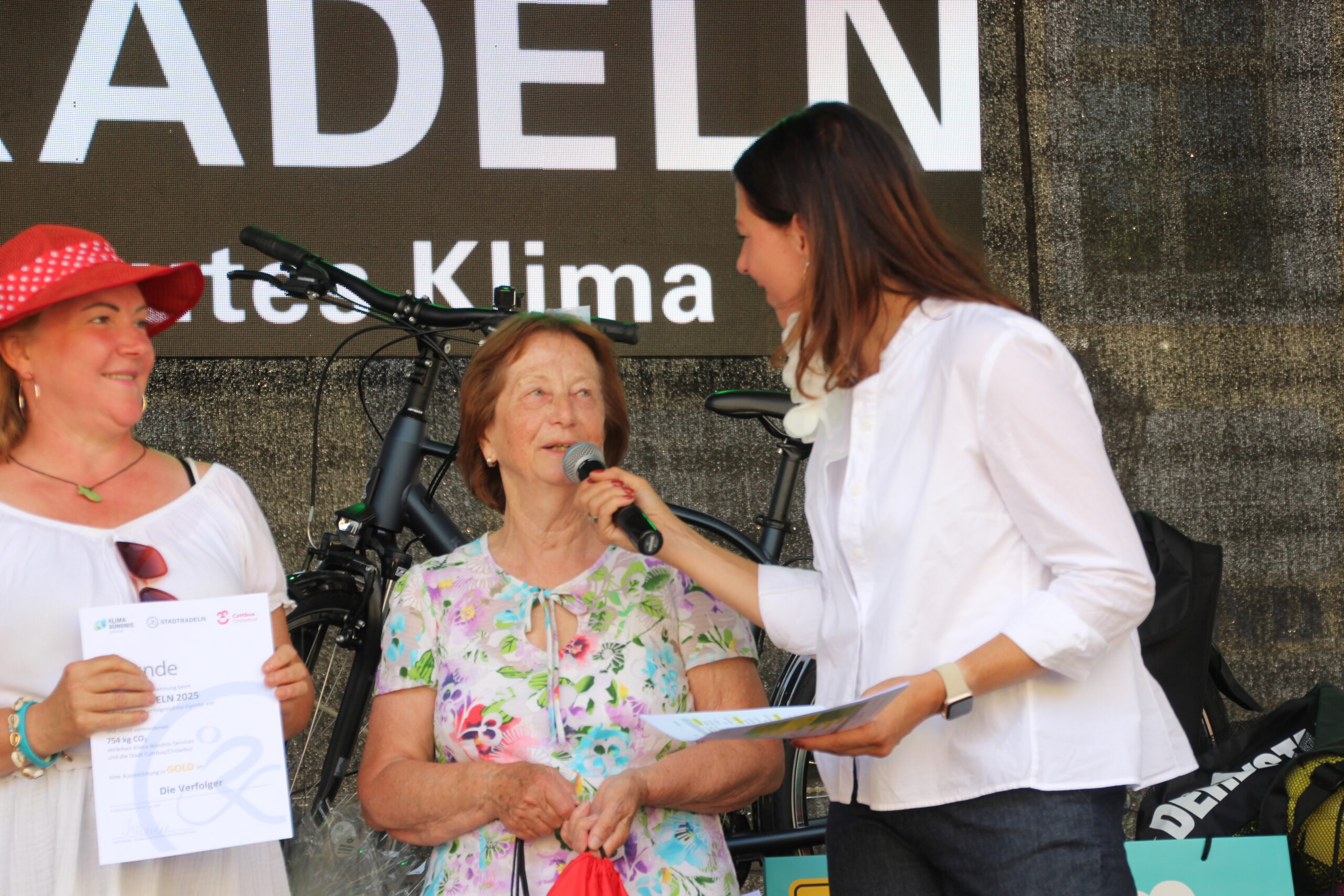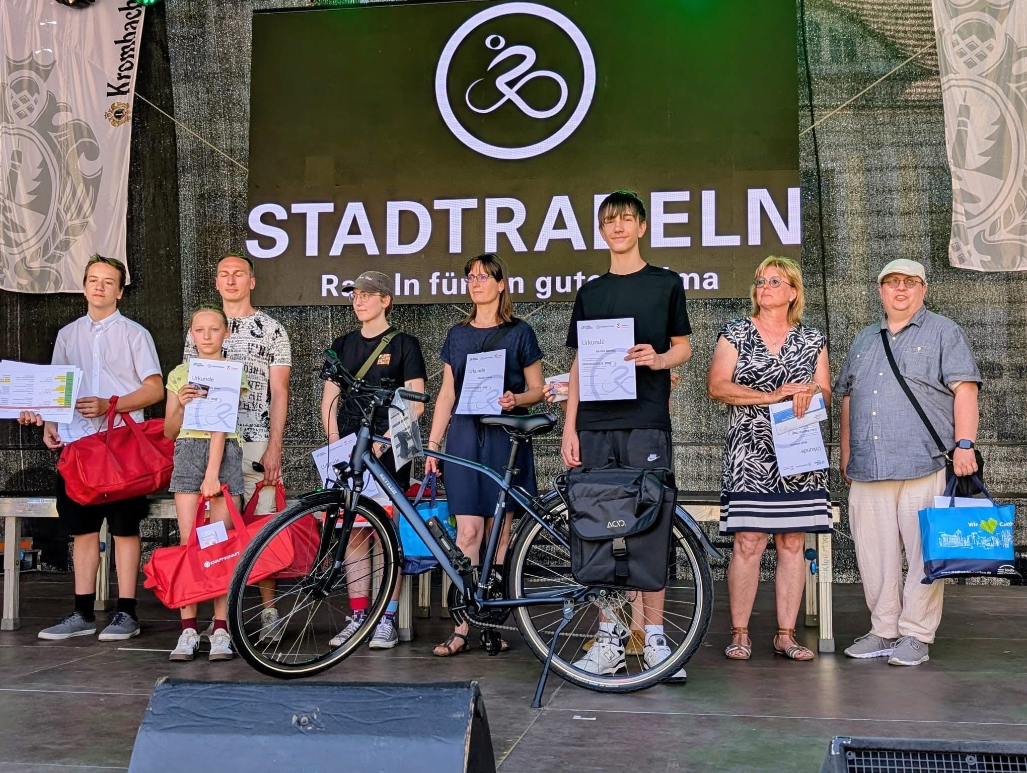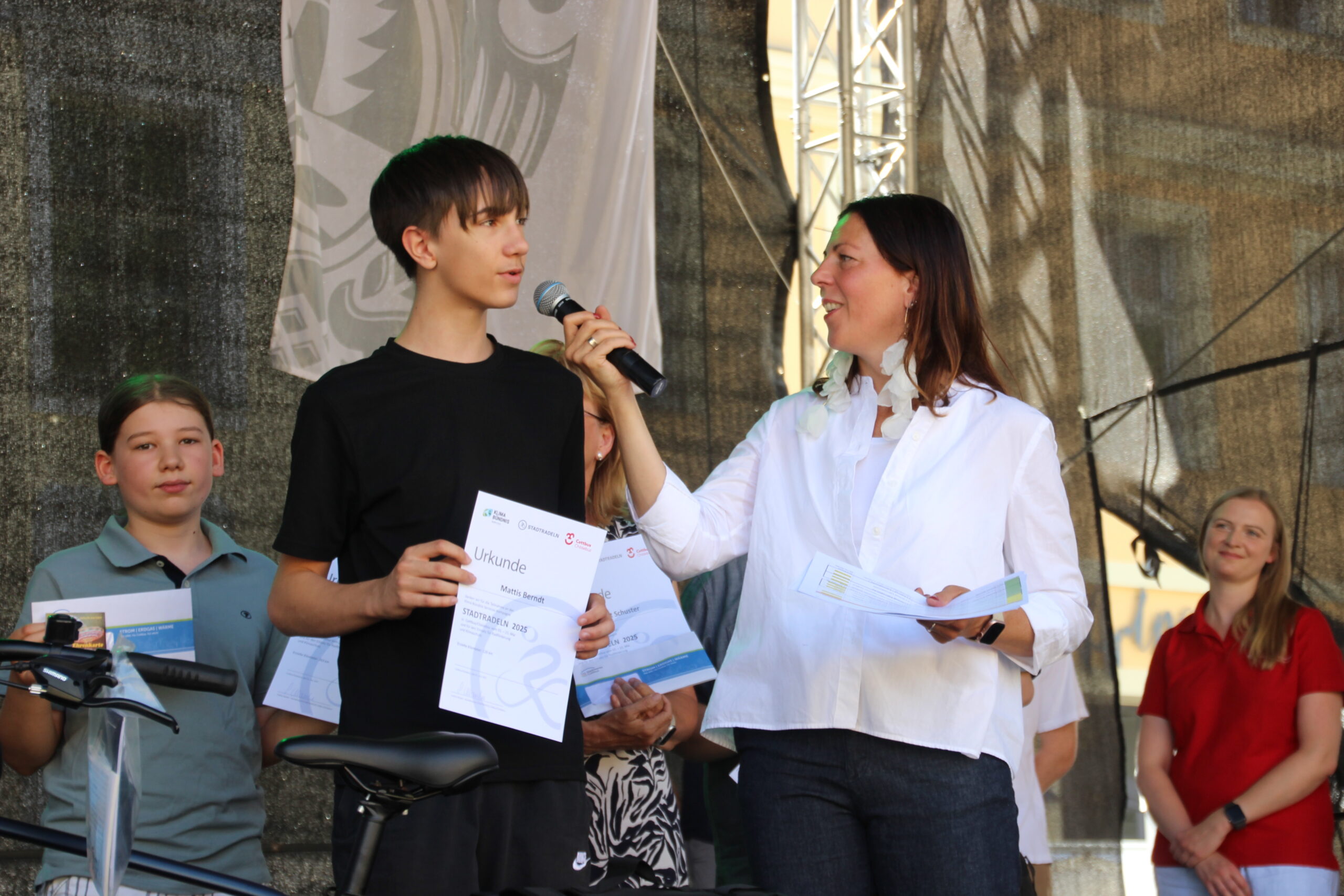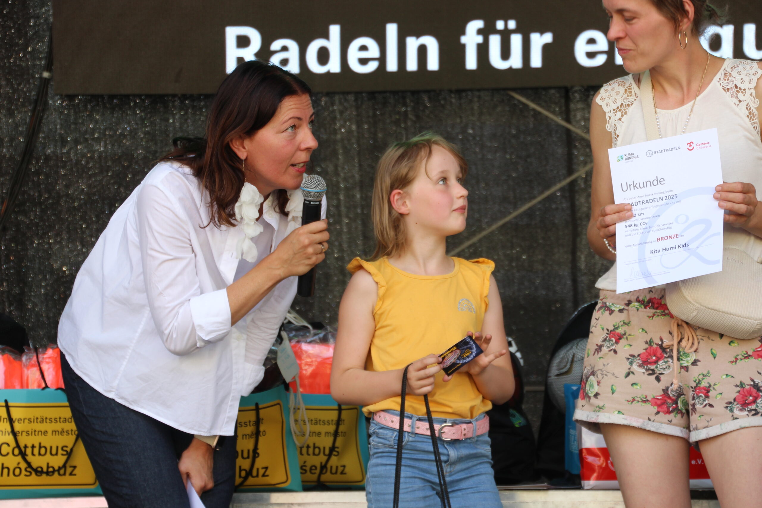 Am Sonntag, 22.06.2025, sind die erfolgreichsten Teams und Radelnde sowie die glücklichen Losgewinner im Rahmen einer feierlichen Preisverleihung auf dem Cottbuser Stadtfest auf der Bühne am Altmarkt von Bürgermeisterin Doreen Mohaupt ausgezeichnet worden.
