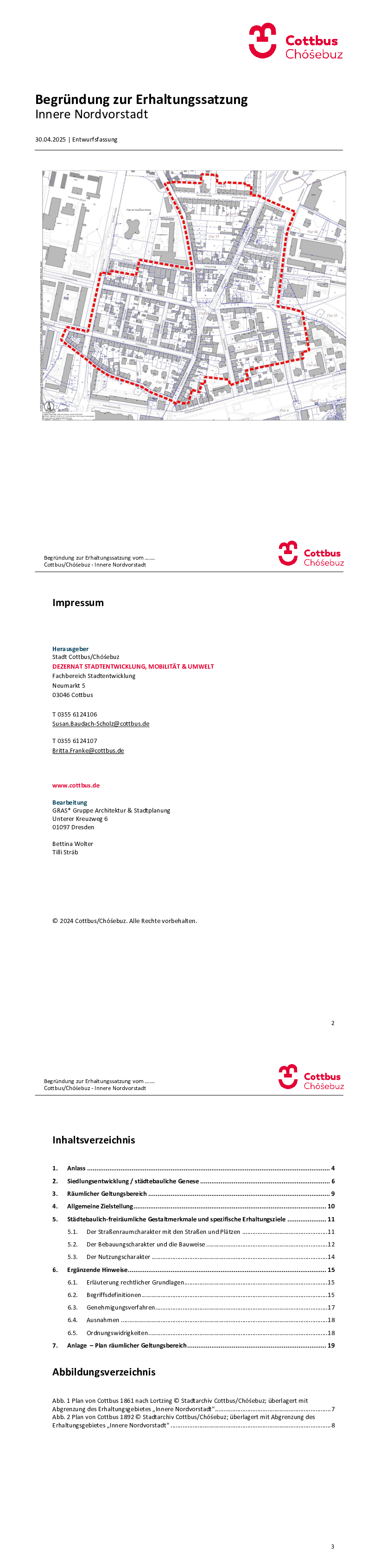Die Beteiligung der Öffentlichkeit zum Entwurf der Erhaltungssatzung in der Fassung vom 30.04.2025 erfolgt durch die Einstellung der Unterlagen ins Internet im Zeitraum vom 19.05.2025 bis 19.06.2025 auf der Seite cottbus.de/bauplanung.