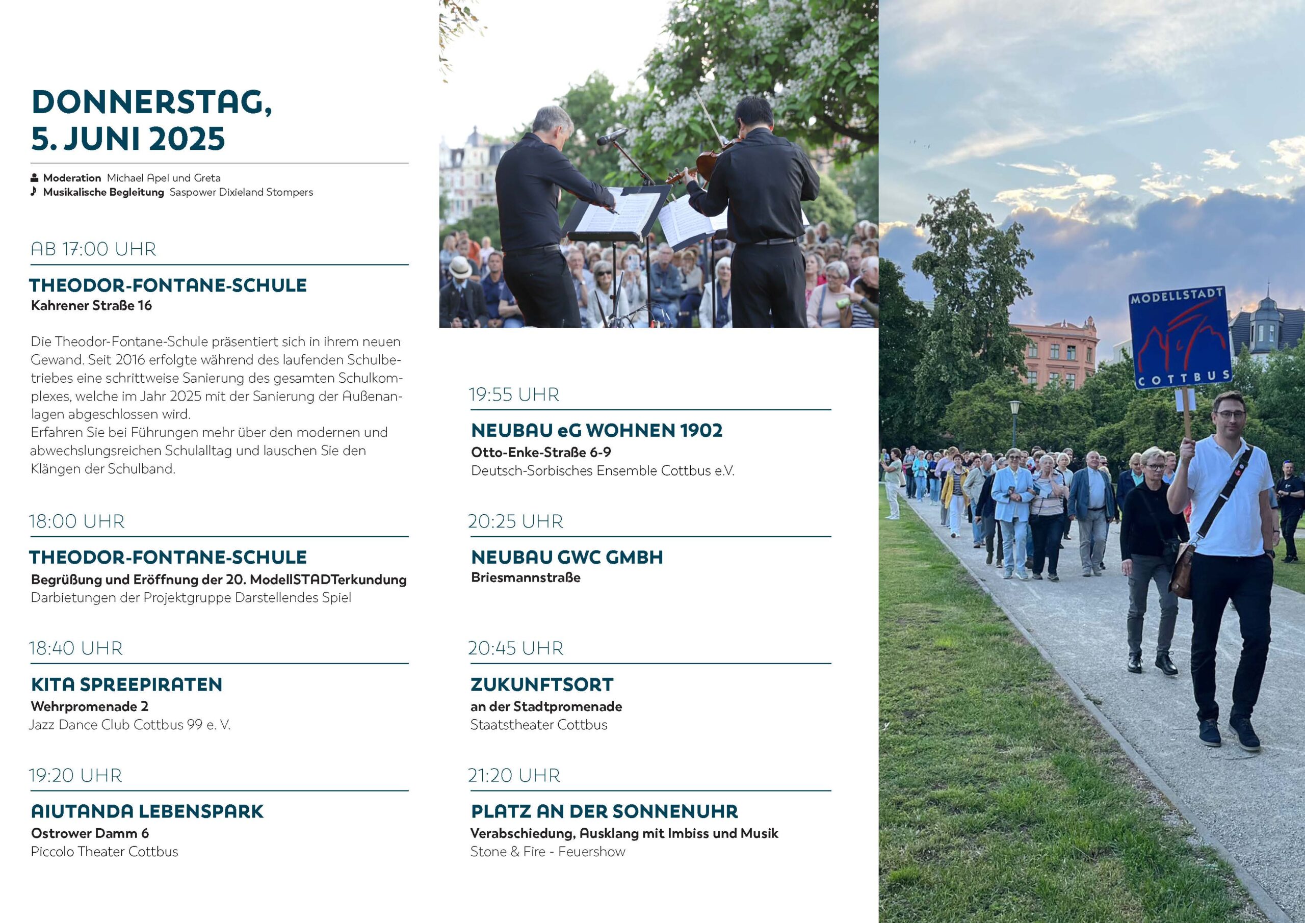 Die Innenstadt von Cottbus/Chóśebuz neu entdecken – das ist am Donnerstag, 05.06.2025, einmal mehr möglich. Alle Interessierten sind herzlich eingeladen, sich dem abendlichen Stadtrundgang durch die erweiterte Cottbuser Innenstadt anzuschließen. An sieben Stationen, begleitet von musikalischen, tänzerischen und schauspielerischen Darbietungen, ist Neues und Hintergründiges zu fertiggestellten, derzeit in Umsetzung und in Planung befindlichen Projekten der Stadtentwicklung zu erfahren. Musikalisch und kulturell wird der Rundgang in altbewährter Tradition durch die Saspower Dixieland Stompers begleitet.