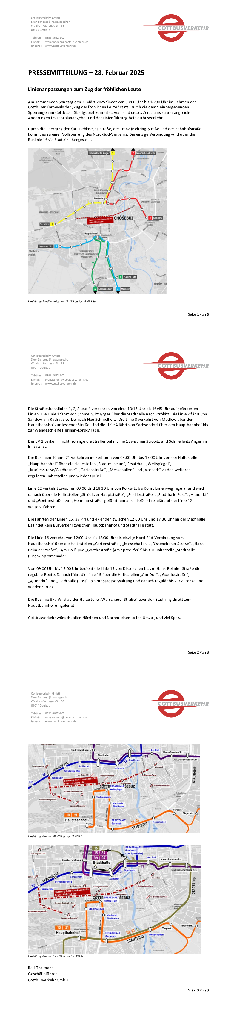 Am kommenden Sonntag den 2. März 2025 findet von 09:00 Uhr bis 18:30 Uhr im Rahmen des Cottbuser Karnevals der „Zug der fröhlichen Leute“ statt. Durch die damit einhergehenden Sperrungen im Cottbuser Stadtgebiet kommt es während dieses Zeitraums zu umfangreichen Änderungen im Fahrplanangebot und der Linienführung bei Cottbusverkehr.