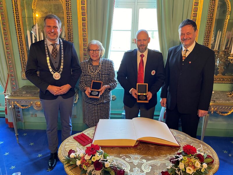 Dr. Ralph Matzky wird geehrt für sein breites ehrenamtliches Engagement in Strukturen des Rettungsdienstes sowie des Gesundheits- und Katastrophenschutzes. Auch ihn würdigte OB Tobias Schick in einer Laudatio. Darin heißt es u.a.: