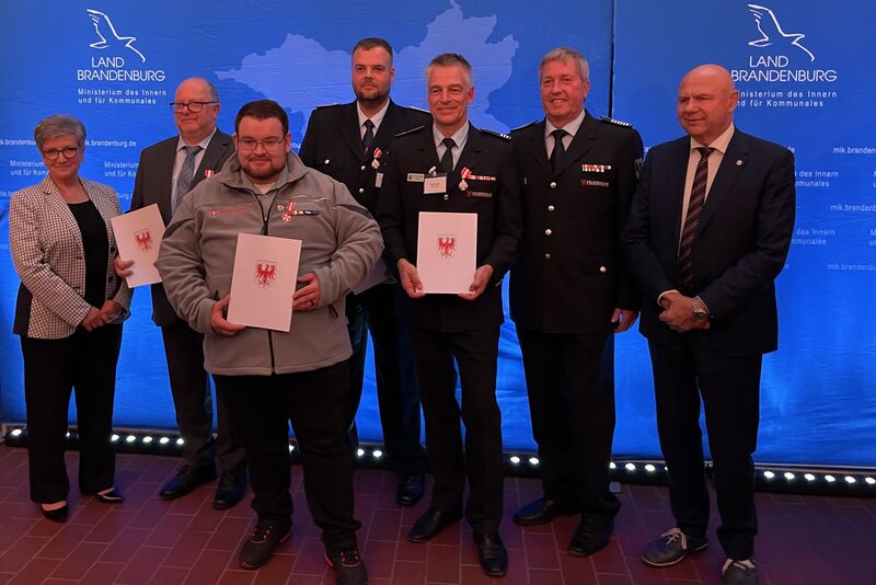 Innenstaatssekretär Dr. Markus Grünewald hat am Freitag, 27. September 2024, 66 Frauen und Männern das Ehrenzeichen im Brand- und Katastrophenschutz des Landes Brandenburg verliehen. Der Staatssekretär überreichte die Ehrenzeichen bei einem Festempfang in Klaistow (Landkreis Potsdam-Mittelmark) an Angehörige der Feuerwehren und der Einheiten und Einrichtungen des Katastrophenschutzes für besondere Leistungen. Aus der Stadt Cottbus/Chóśebuz erhielten diese Auszeichnung: Christian Gluschke von der Johanniter-Unfall-Hilfe, Armin Beintmann, Mitglied der Freiwillige Feuerwehr Cottbus-Sielow, Volker Tischer vom Team der Regionalleitstelle Lausitz und Kay Kruppa von der Berufsfeuerwehr Cottbus.