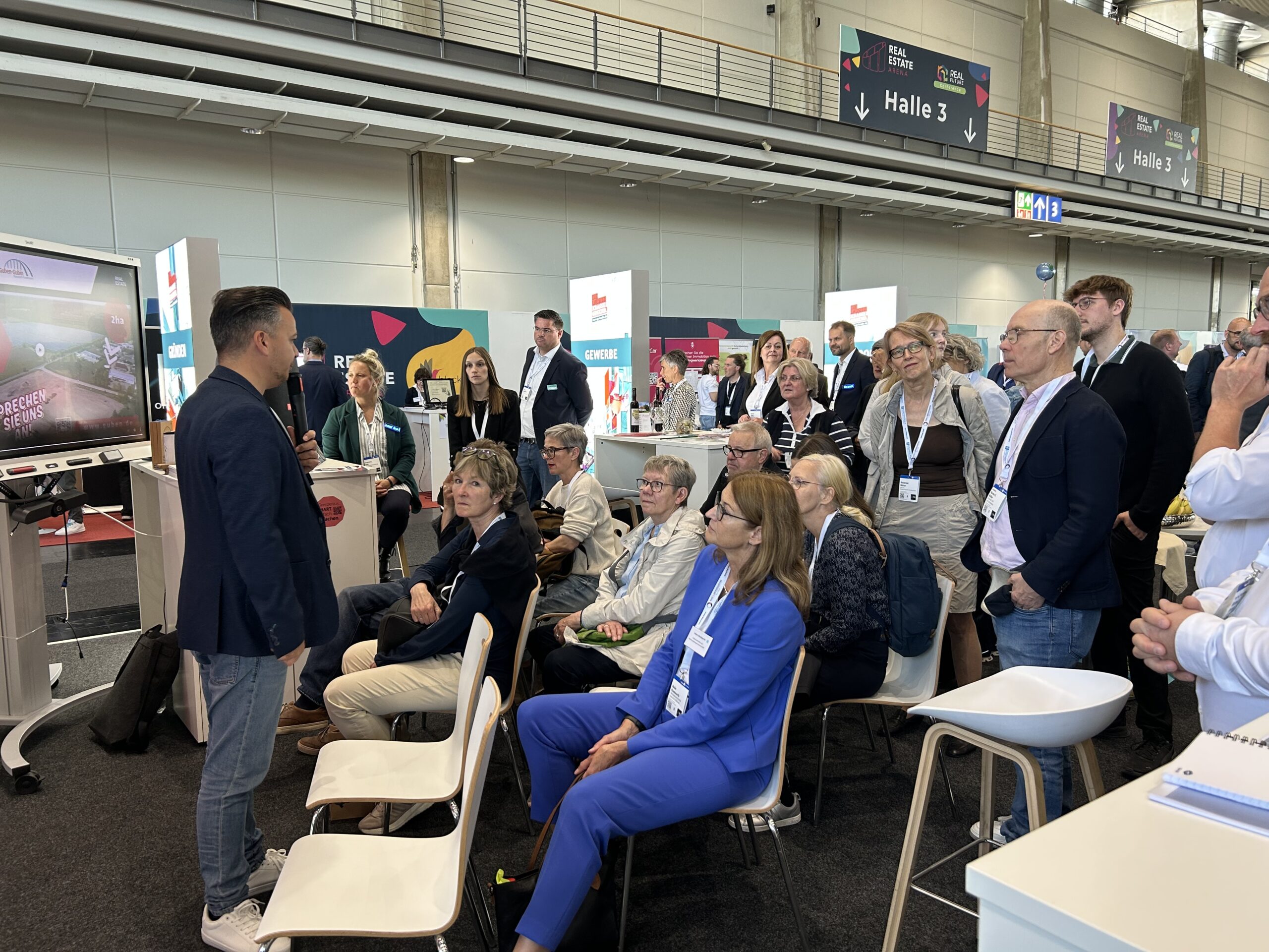 An den beiden Messetagen zog der 88 m² große Gemeinschaftsstand sowohl die Aufmerksamkeit der 400 weiteren Aussteller als auch von tausenden Fachbesuchern auf sich. Zahlreiche Gespräche mit Interessierten, die zum Teil bereits im Vorfeld vereinbart werden konnten, fanden am Stand statt. Allein etwas mehr als 40 Mitglieder der Bundesarchitektenkammer und Architektenkammer Niedersachsen lernten die Lausitz bei einer Kurzpräsentation am Gemeinschaftsstand (neu) kennen. Tim Berndt, Geschäftsführer der EGC Entwicklungsgesellschaft Cottbus mbH, bemerkt zur Umsetzung des Impulses aus der Cottbuser Wirtschaft: „Der Wunsch aus dem Immobiliennetzwerk gab den Anstoß zu einem neuen, kooperativen Format – nicht ohne Hürden haben wir gern den Weg für diesen gemeinsamen Auftritt bereitet.“ Weiterhin erklärt er: „Es kam beim Publikum sehr gut an, dass wir im Team die Lausitz als grenzübergreifende Chancenregion vorgestellt haben. Eine tolle Kooperation, die Spaß gemacht hat und Synergien ermöglichte.“ In direkter Nachbarschaft zur Immobilienmesse fand der Deutsche Städtetag statt. Trotz engem Terminplan konnte OB Tobias Schick der Einladung zur Elefantenrunde auf der Main Stage folgen. Unter der Überschrift „Die Zukunft des Wohnens und des Bauens“ referierten ausgewählte Vertreter um Belit Onay, Oberbürgermeister von Hannover und Axel Gedaschko, Präsident des GdW – Bundesverbandes der deutschen Wohnungs- und Immobilienunternehmen. Konsens war u.a. die Notwendigkeit von Bürokratieabbau sowie beschleunigten Verfahren. Zeitgleich beeindruckte Dr. Markus Niggemann das erlesene Plenum in seiner Projektvorstellung mit dem kooperativen Bestreben der Region, Europas erstes Net Zero Valley werden zu wollen.