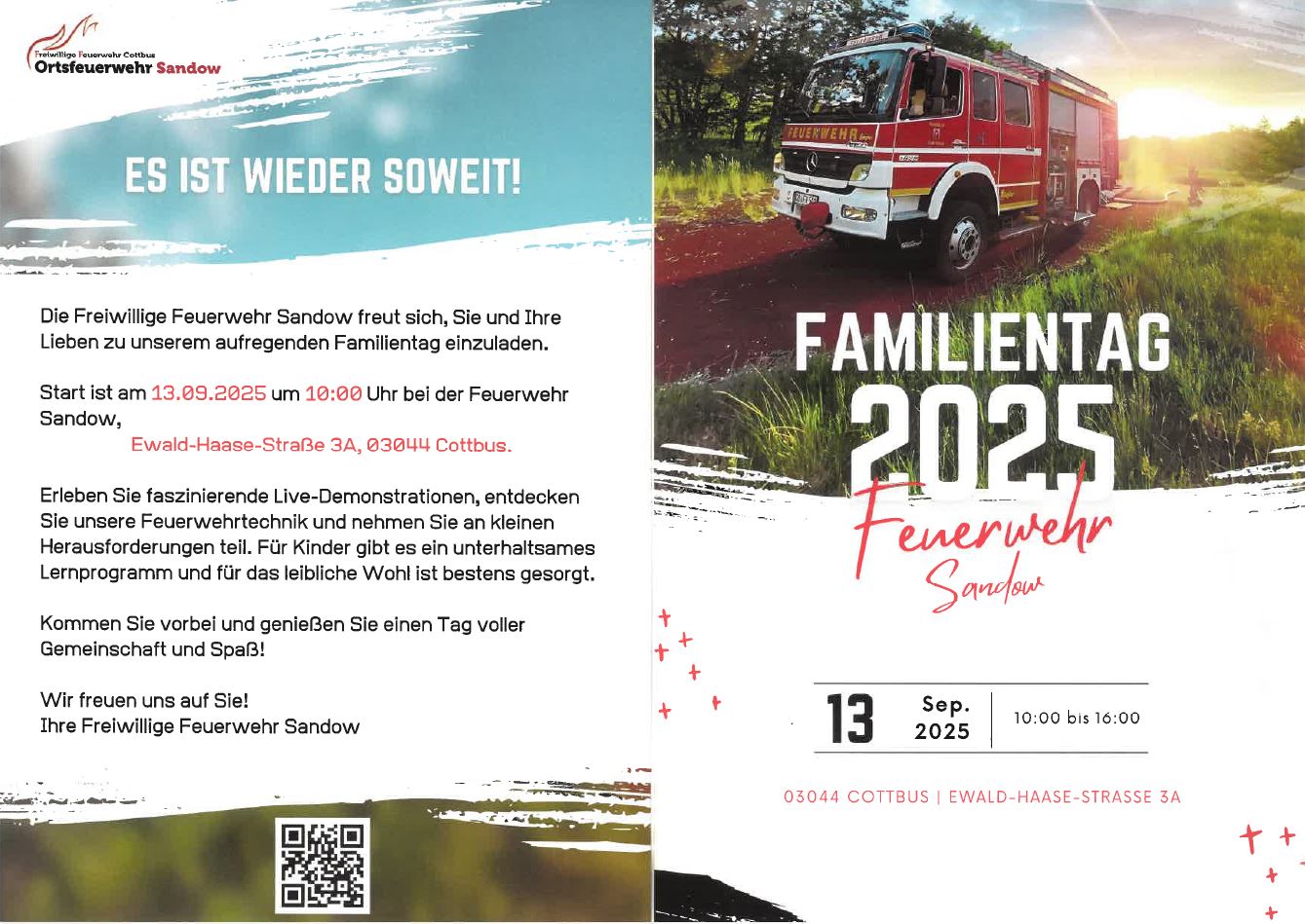Am Samstag, den 13. September 2025, lädt die Freiwillige Feuerwehr Sandow alle Bürgerinnen und Bürger herzlich zum großen Familientag ein. Von 10:00 bis 16:00 Uhr erwartet die Gäste auf dem Gelände der Feuerwehr in der Ewald-Haase-Straße 3A, 03044 Cottbus, ein abwechslungsreiches Programm für Groß und Klein.