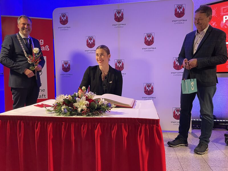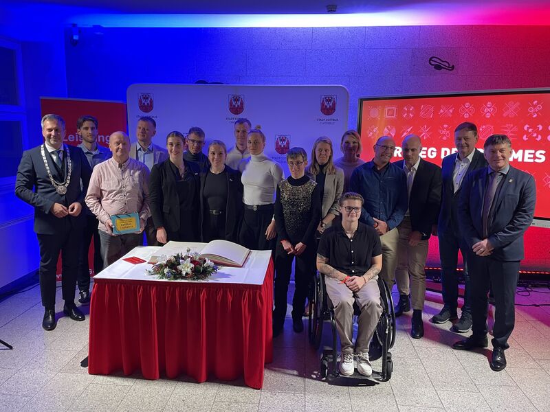 Die olympischen und paralympischen Medaillengewinnerinnen und -gewinner aus Cottbuser Vereinen sind seit Mittwoch, 20.11.2024, erneut mit neuen Plaketten auf dem „Weg des Ruhmes“ in Cottbus/Chóśebuz verewigt. Geehrt wurden damit Para-Schwimmer Josia Topf sowie die Para-Cyclistin Maike Hausberger, die in Paris drei bzw. zwei Medaillen, darunter Gold, holten. Zugleich trugen sich die Radsportlerinnen Lea-Sophie Friedrich, Emma Hinze und Pauline Grabosch, die in Paris Silber und Bronze gewannen, mit den weiteren Teilnehmerinnen und Teilnehmern der Pariser Spiele und den Trainerinnen und Trainern in das Goldene Buch der Stadt Cottbus/Chóśebuz ein.