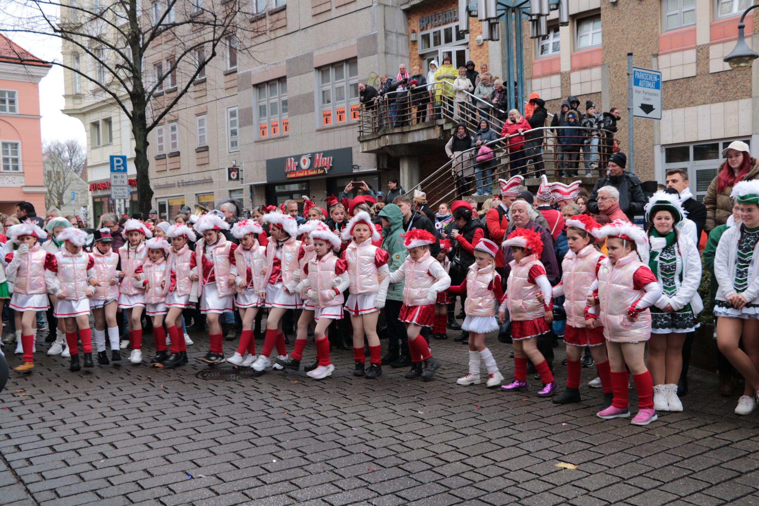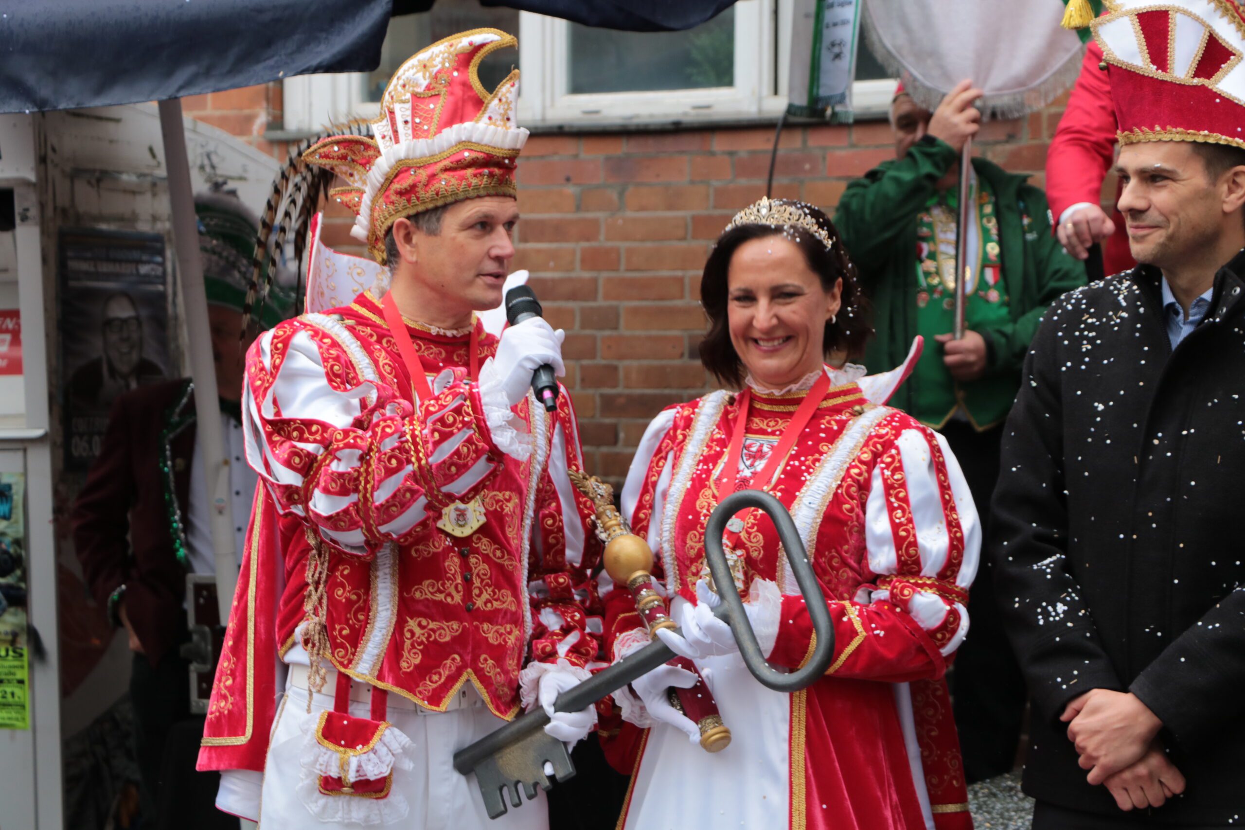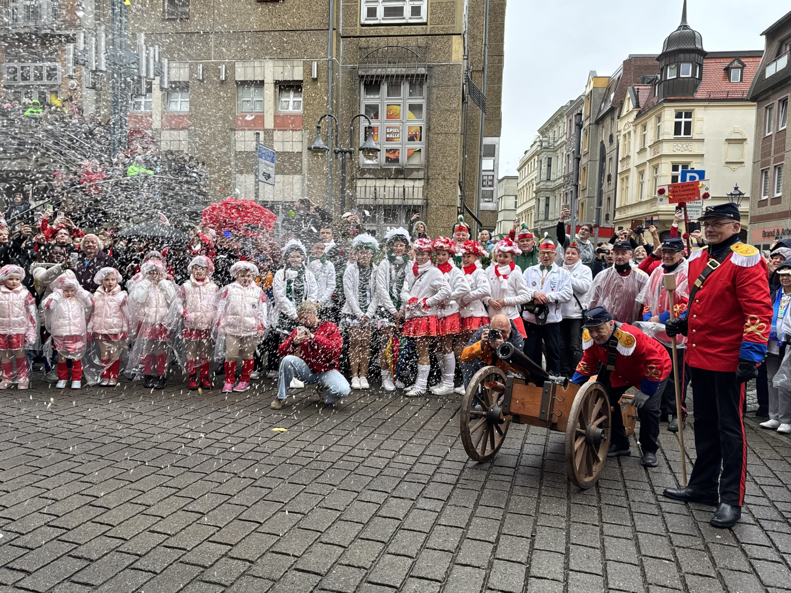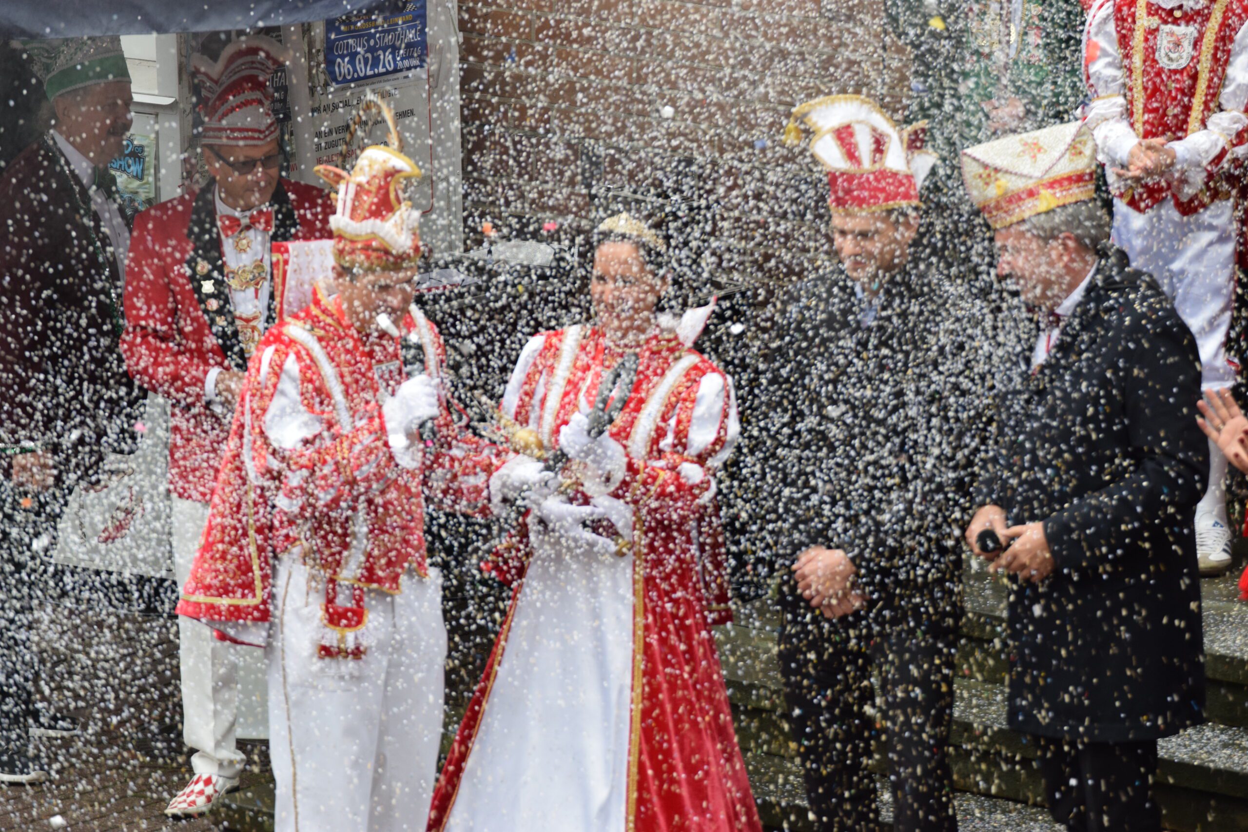 Machtwechsel in Cottbus/Chóśebuz: Das Stadtprinzenpaar Sebastian I und Sonnika I von der Interessengemeinschaft Cottbuser Carneval (ICC) hat am Dienstag, 11.11, pünktlich um 11:11 Uhr den Rathausschlüssel von Oberbürgermeister Tobias Schick übernommen. Mehrere hundert Beteiligte und Schaulustige ließen sich auch von zeitweisem Regen nicht schrecken, sie sangen, tanzten, feierten nach dem traditionellen Kanonenschuss um 11:11 Uhr. Beteiligt waren insgesamt sechs Karnevalsvereine bzw. -verbände.
