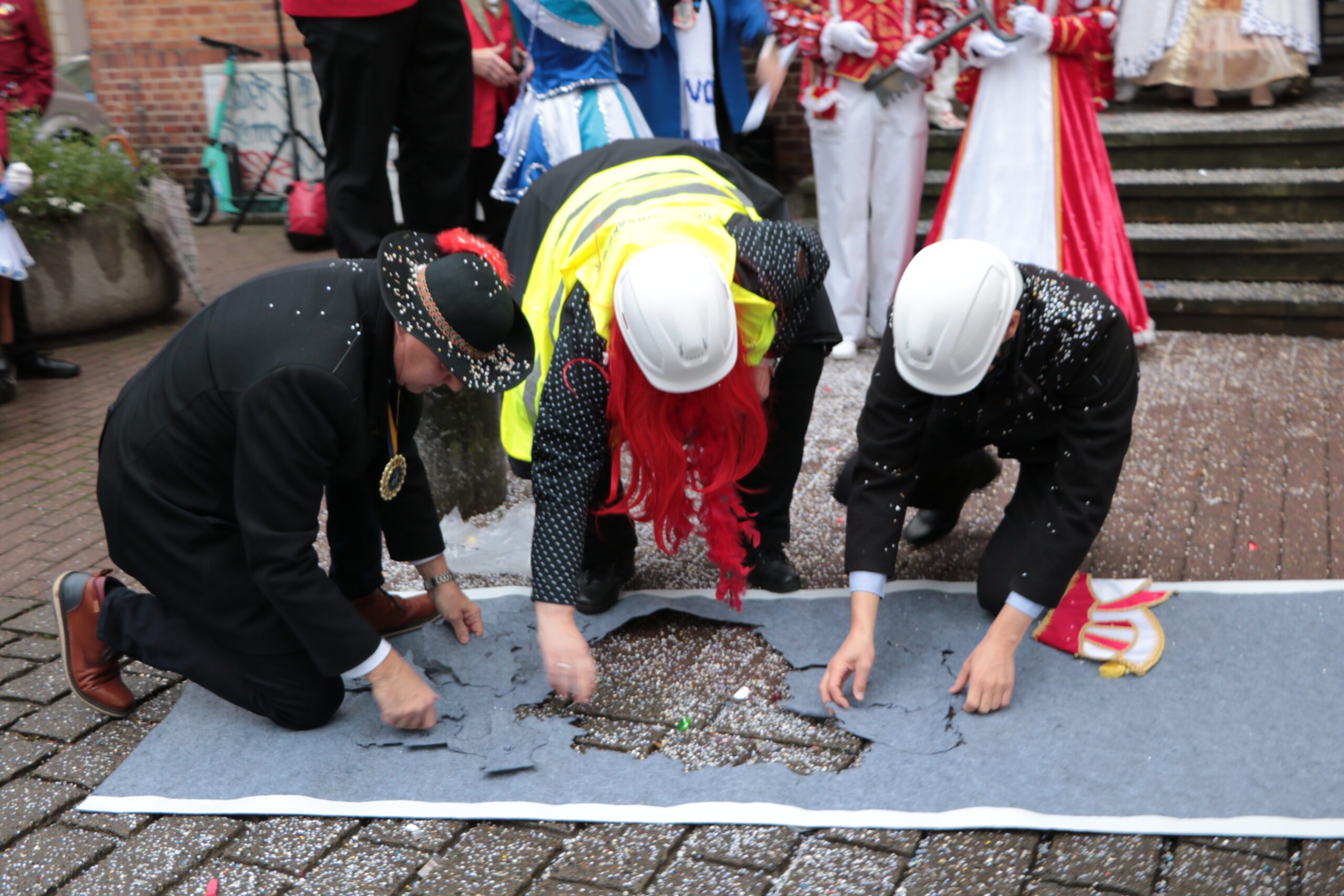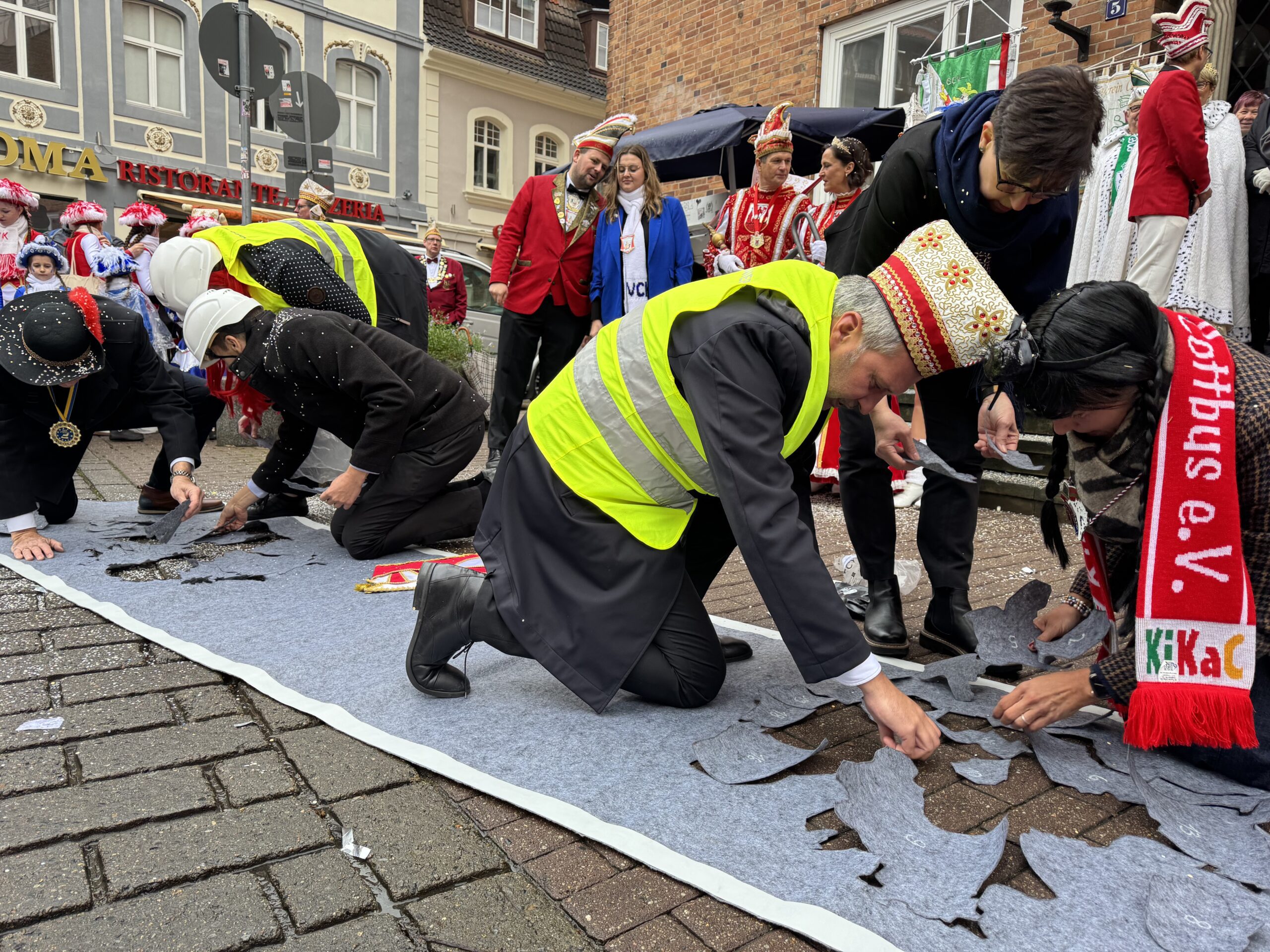 OB Schick und die Rathausspitze mussten zudem in einer löchrigen „Straße“ zwei Löcher mittels Puzzleteilen flicken – einmal den Umriss Deutschlands, einmal den der Stadt Cottbus/Chóśebuz.