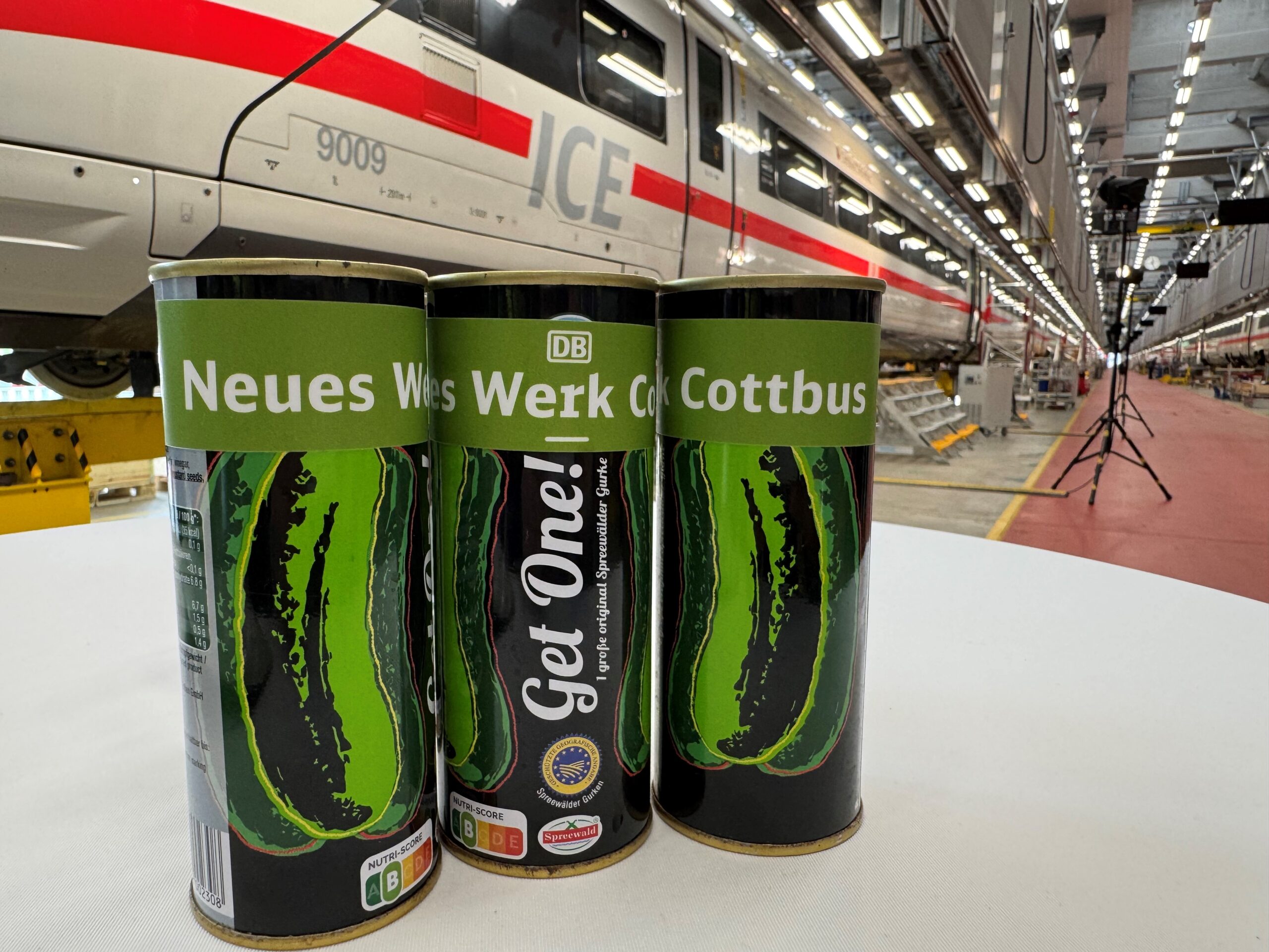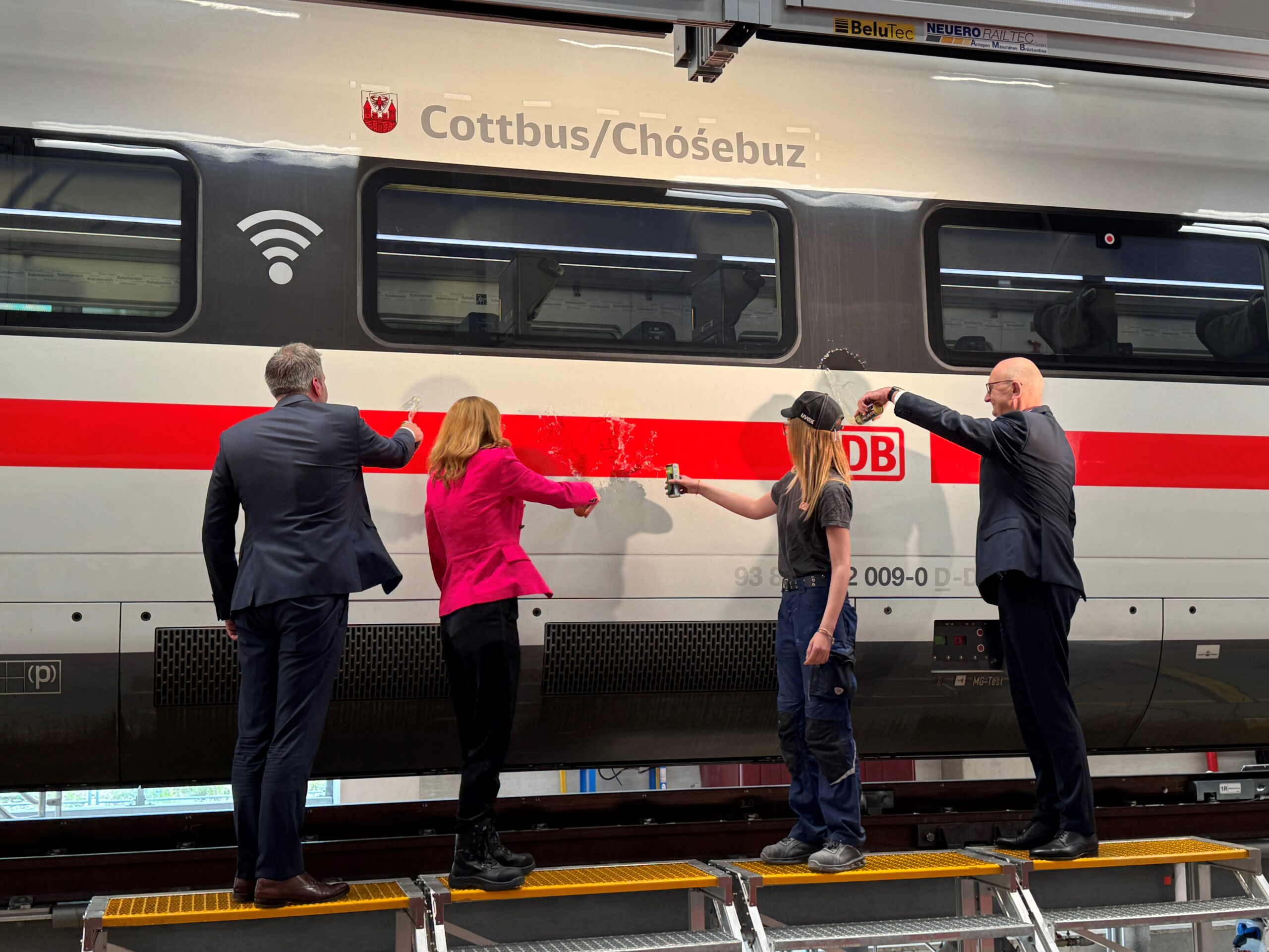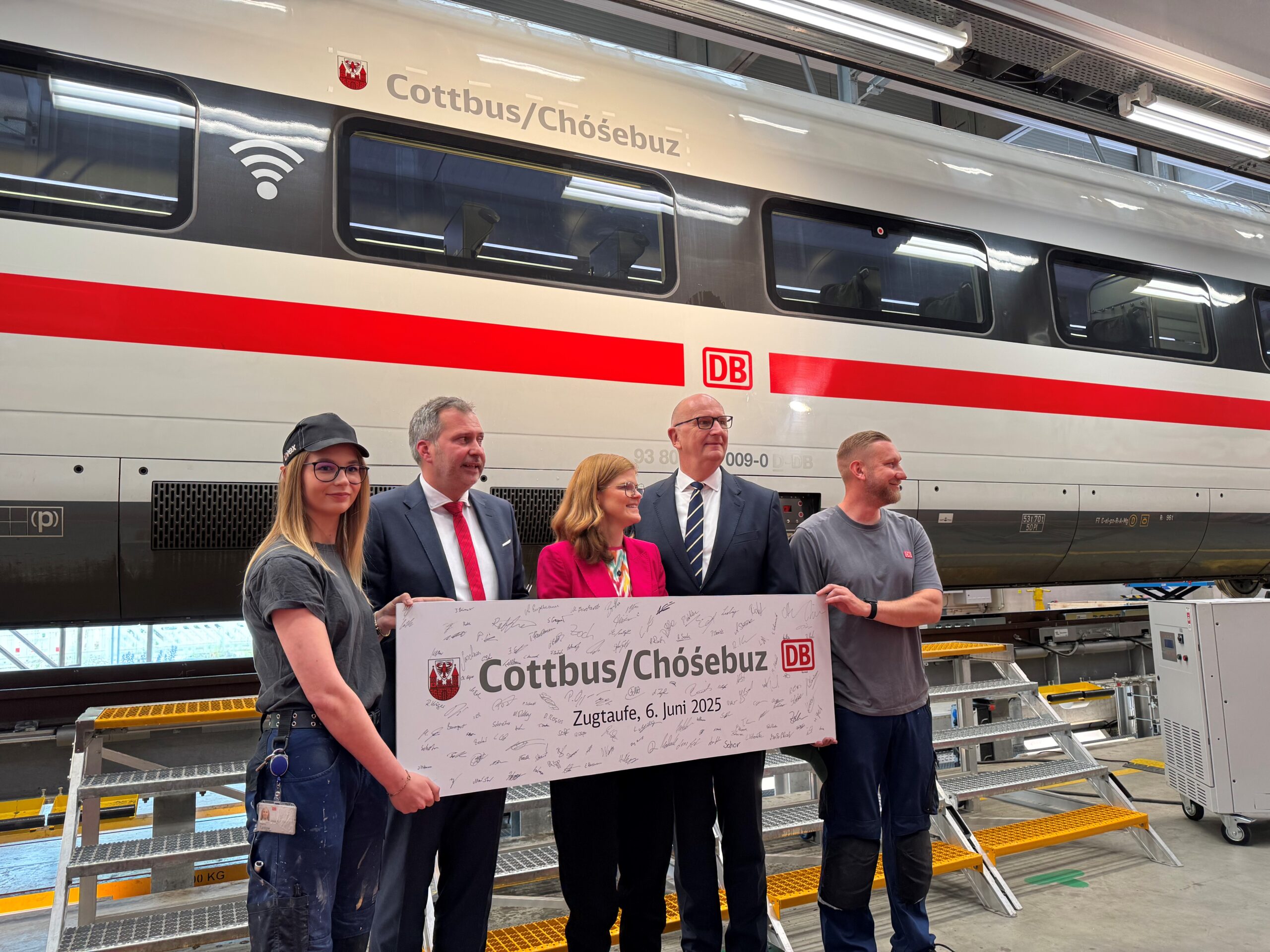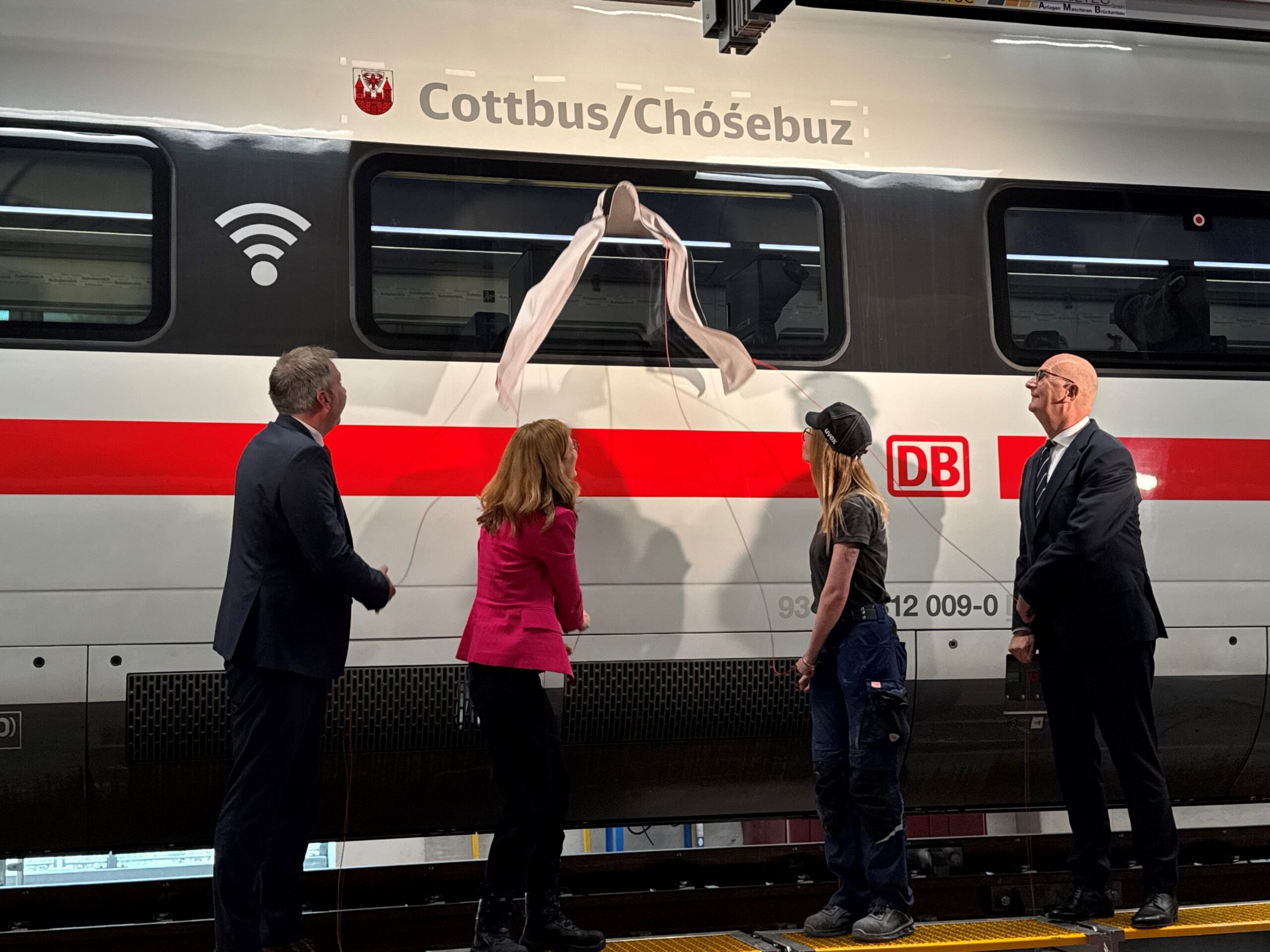 Regionaltypisch mit Spreewälder Gurkenwasser wurde der ICE-Triebzug 9009 im neuen Werk der DB in Cottbus/Chóśebuz getauft. Brandenburgs Ministerpräsident Dr. Dietmar Woidke, der Cottbuser Oberbürgermeister Tobias Schick, Dr. Daniela Gerd tom Markotten, DB-Vorständin für Digitalisierung und Technik, und Angelina Tantow, Fahrzeuglackiererin in Ausbildung im neuen Werk Cottbus, enthüllten gemeinsam das Stadtwappen und Schriftzug „Cottbus / Chóśebuz“. Diese sind jetzt rechts und links an beiden Spitzen des rund 350 Meter langen ICE zu sehen.