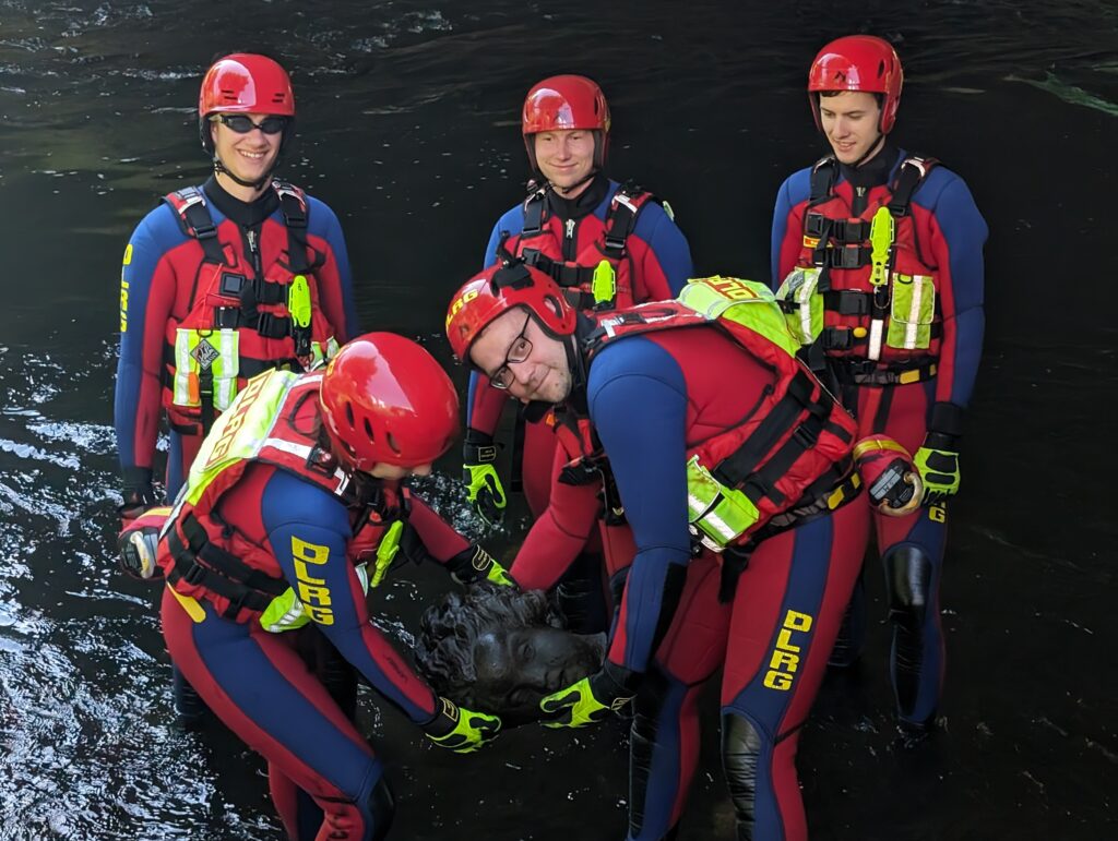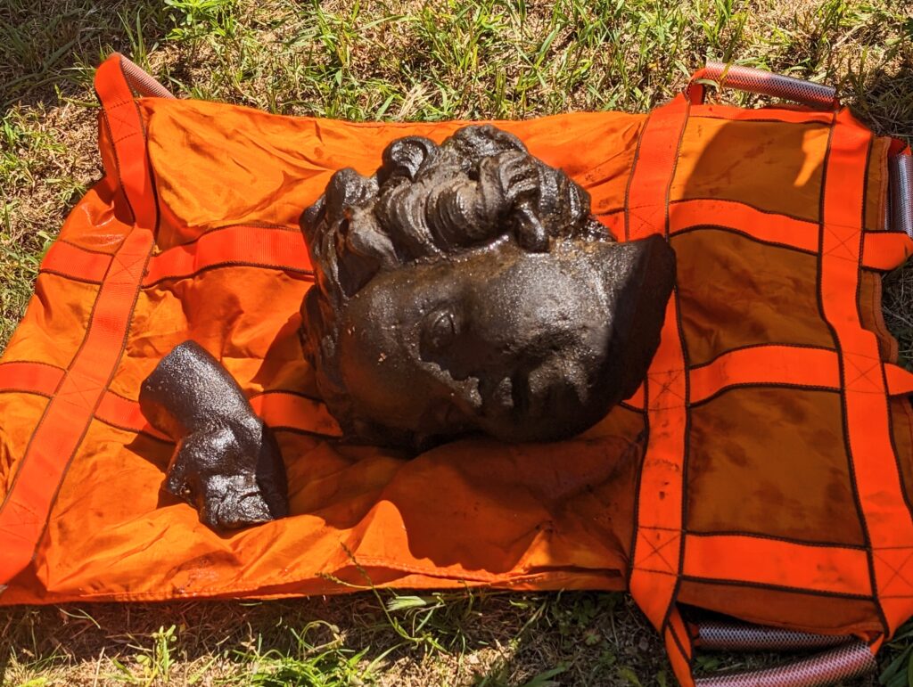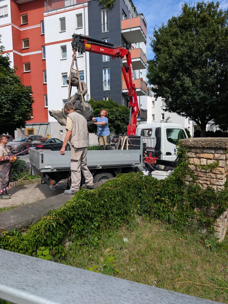 Nachdem die Skulptur um die Silvesternacht 2023/24 von Unbekannten zerstört wurde, begann ein langwieriger Bergungs- und Instandsetzungsprozess von ca. 1,5 Jahren. Erste Teile konnten noch im Winter 2024 von den Mitarbeiterinnen des Kulturreferats aus den Randbereichen der Spree geborgen werden. So lag die Vermutung nahe, dass sich auch weitere Teile in der danebenliegenden Spree befinden könnten. Durch den regenreichen Winter 2024 und dem damit verbundenen hohen Pegelstand des Flusses konnte die Bergung erst im Sommer mit der tatkräftigen Unterstützung der DLRG – Deutsche Lebens-Rettungs-Gesellschaft fortgesetzt werden.