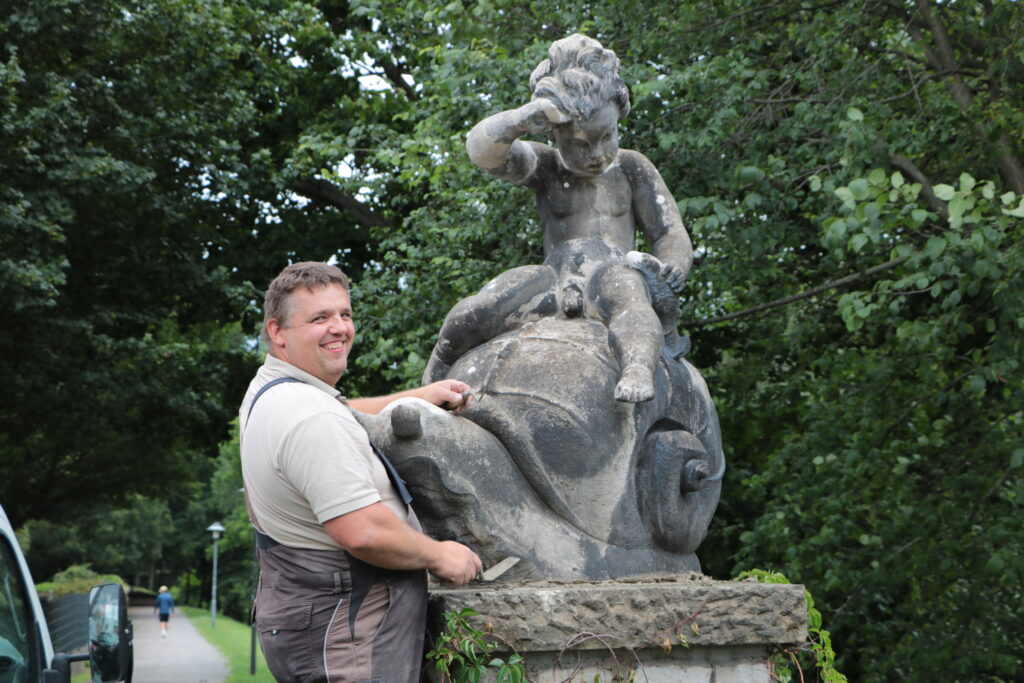 Die historische Sandsteinskulptur „Putte mit Schnecke“, im Volksmund besser bekannt als der „Schneckenreiter“, kann nach umfassender Restaurierung wiederaufgestellt werden. Am 23.07.2025 um 11:00 Uhr wird die Skulptur unter dem Beisein der Öffentlichkeit wieder auf ihren ursprünglichen Sockel an der Spreebrücke an der Franz-Mehring-Straße gehoben.