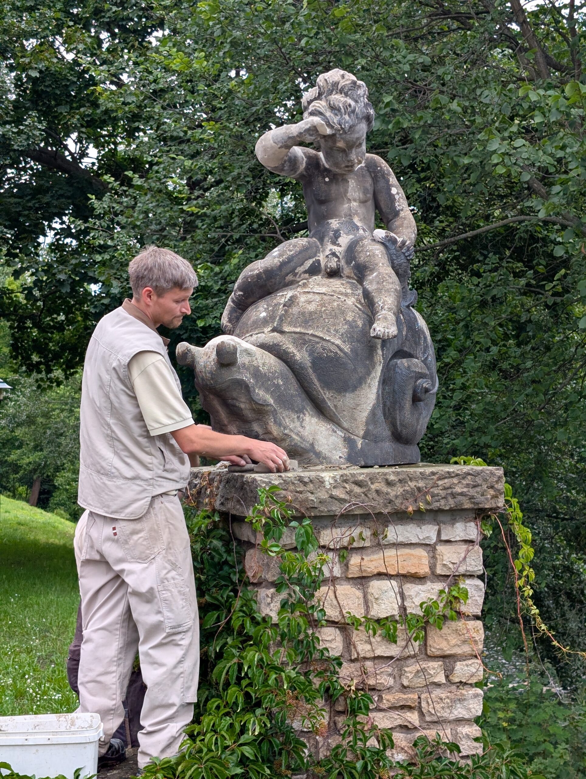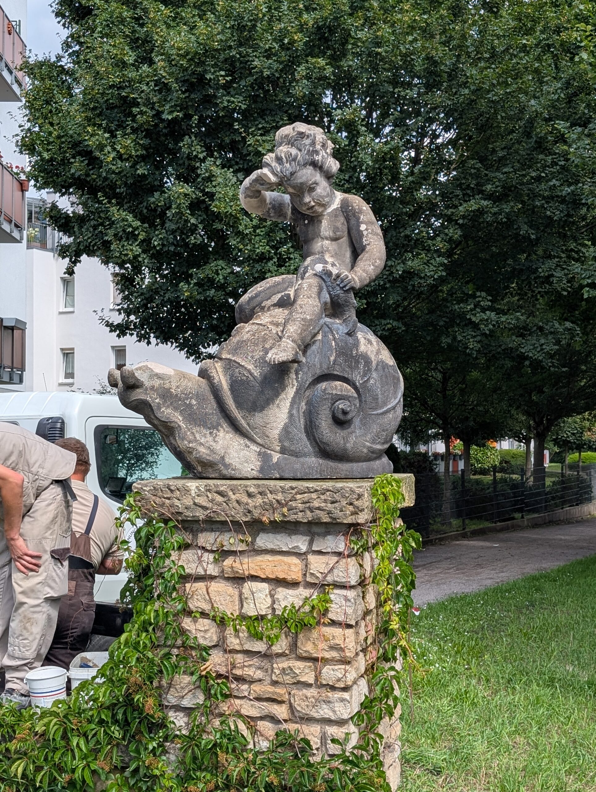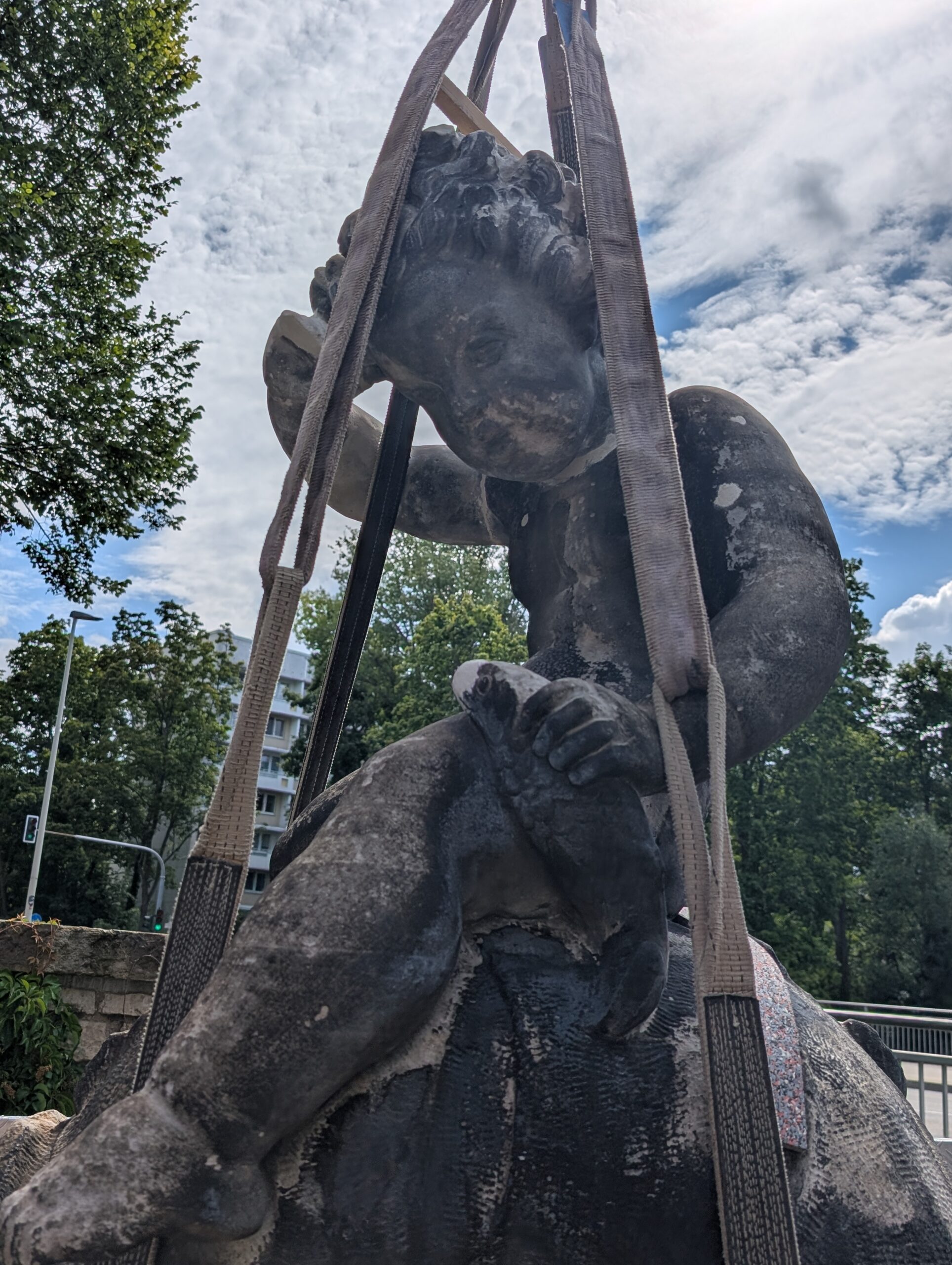 Die historische Sandsteinskulptur „Putte mit Schnecke“, im Volksmund besser bekannt als der „Schneckenreiter“, kann nach umfassender Restaurierung wiederaufgestellt werden. Am 23.07.2025 um 11:00 Uhr wird die Skulptur unter dem Beisein der Öffentlichkeit wieder auf ihren ursprünglichen Sockel an der Spreebrücke an der Franz-Mehring-Straße gehoben.