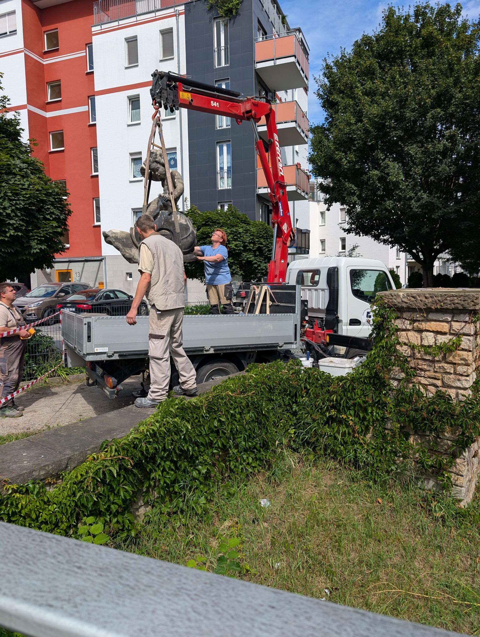 Nachdem die Skulptur um die Silvesternacht 2023/24 von Unbekannten zerstört wurde, begann ein langwieriger Bergungs- und Instandsetzungsprozess von ca. 1,5 Jahren. Erste Teile konnten noch im Winter 2024 von den Mitarbeiterinnen des Kulturreferats aus den Randbereichen der Spree geborgen werden. So lag die Vermutung nahe, dass sich auch weitere Teile in der danebenliegenden Spree befinden könnten. Durch den regenreichen Winter 2024 und dem damit verbundenen hohen Pegelstand des Flusses konnte die Bergung erst im Sommer mit der tatkräftigen Unterstützung der DLRG – Deutsche Lebens-Rettungs-Gesellschaft fortgesetzt werden.