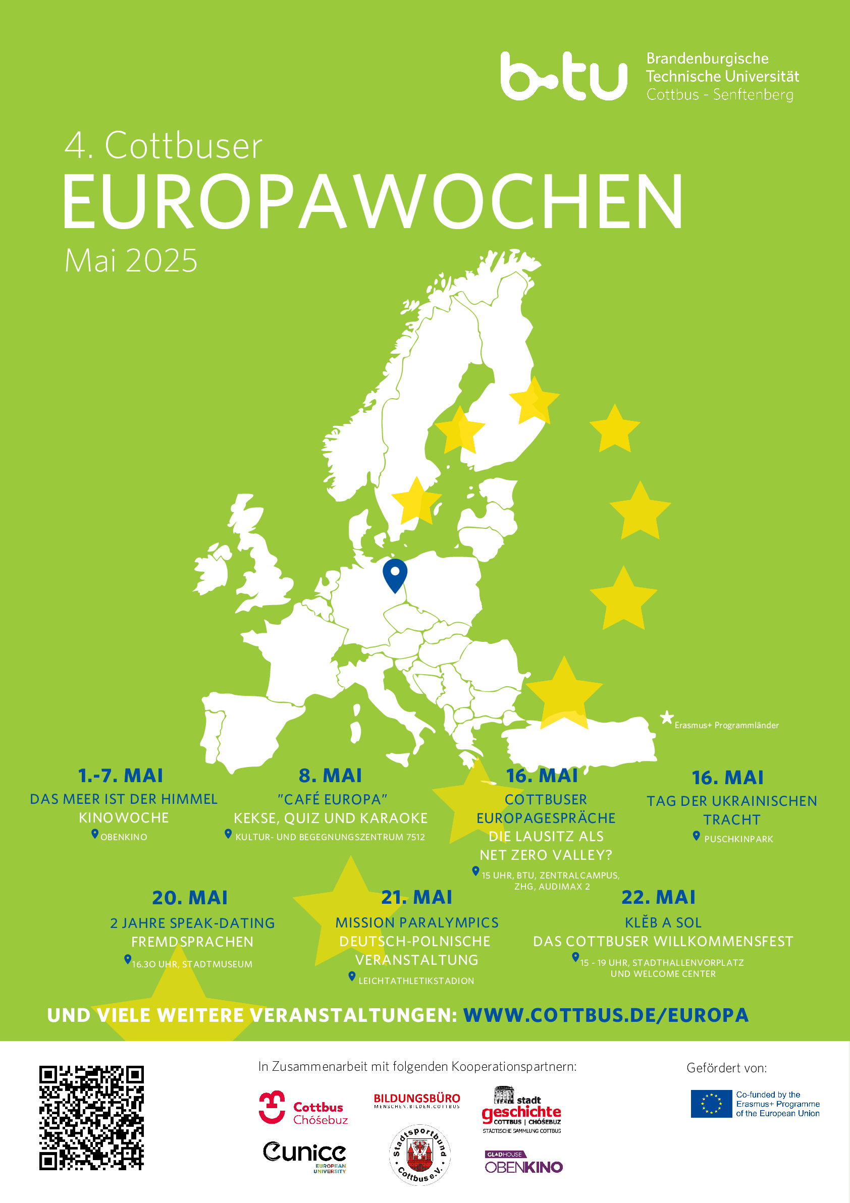 Anlässlich des Europatages am 9. Mai 2025 finden zum vierten Mal die Cottbuser Europawochen statt. Die Brandenburgische Technische Universität Cottbus-Senftenberg (BTU), die Stadt Cottbus/Chóśebuz und zahlreiche Kooperationspartner haben im Monat Mai ein buntes Programm mit vielen spannenden Veranstaltungen zum Thema Europa vorbereitet. Ziel ist es, die europäische Idee zu fördern, interkulturellen Austausch zu ermöglichen und gemeinsame Werte zu feiern. Alle Interessierten sind herzlich eingeladen!