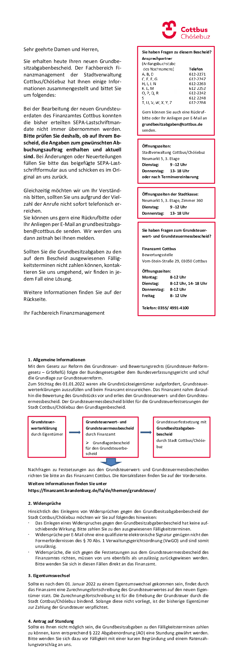 Bitte beachten Sie, dass die Grundsteuer auch dann gezahlt werden muss, wenn gegen den Bescheid ein Widerspruch beim Finanzamt Cottbus oder ein Widerspruch bei der Stadt Cottbus/Chóśebuz eingelegt wurde.