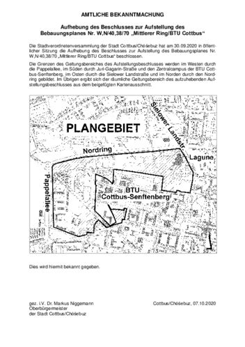 Die Stadtverordnetenversammlung der Stadt Cottbus/Chóśebuz hat am 30.09.2020 in öffentlicher Sitzung die Aufhebung des Beschlusses zur Aufstellung des Bebauungsplanes Nr. W,N/40,38/70 „Mittlerer Ring/BTU Cottbus“ beschlossen.