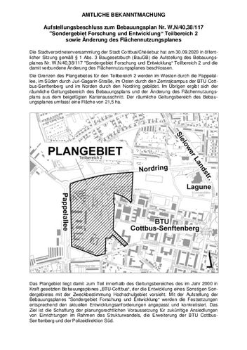 Die Stadtverordnetenversammlung der Stadt Cottbus/Chóśebuz hat am 30.09.2020 in öffentlicher Sitzung gemäß § 1 Abs. 3 Baugesetzbuch (BauGB) die Aufstellung des Bebauungsplanes Nr. W,N/40,38/117 „Sondergebiet Forschung und Entwicklung“ Teilbereich 2 und die damit verbundene Änderung des Flächennutzungsplanes beschlossen.