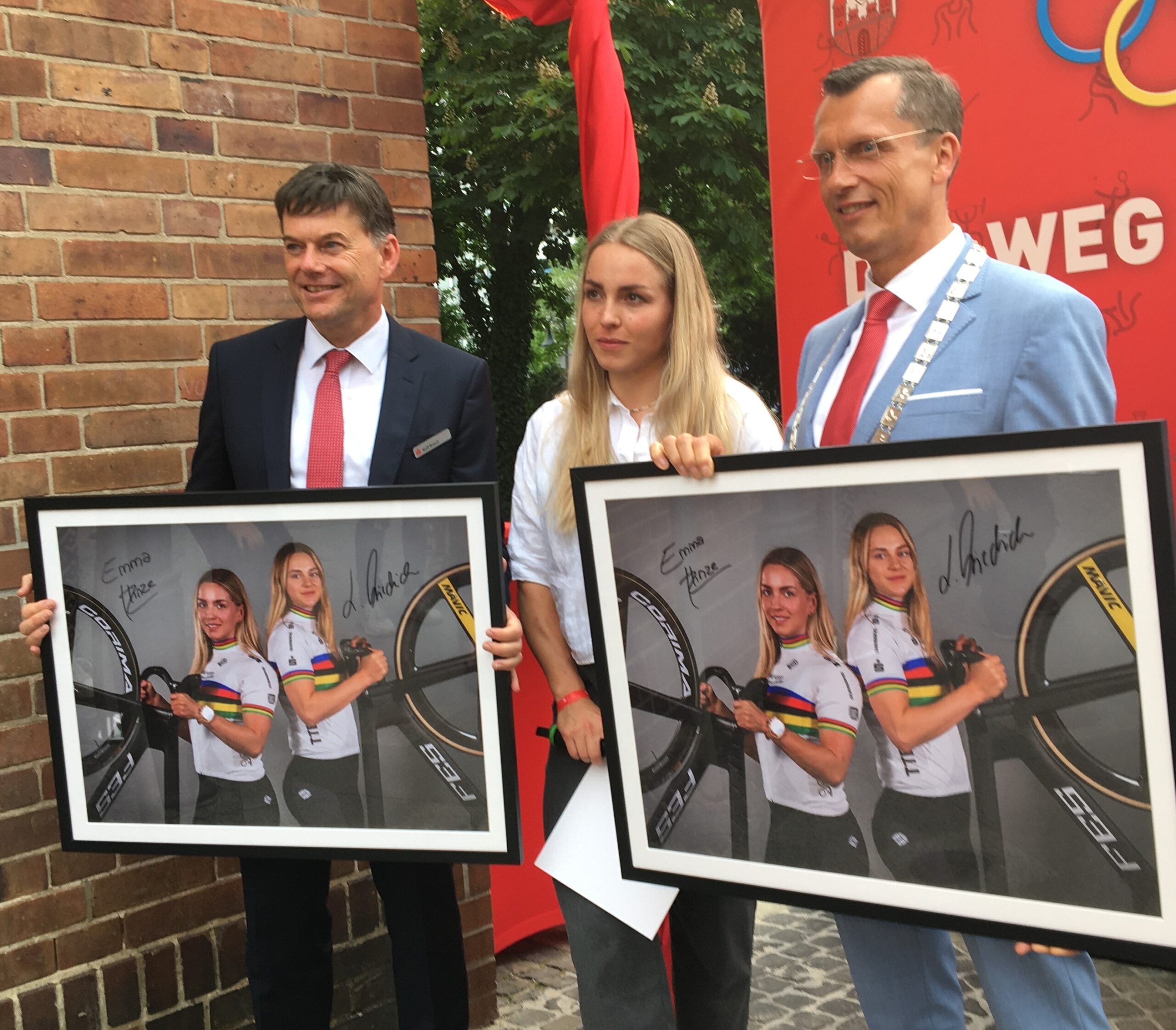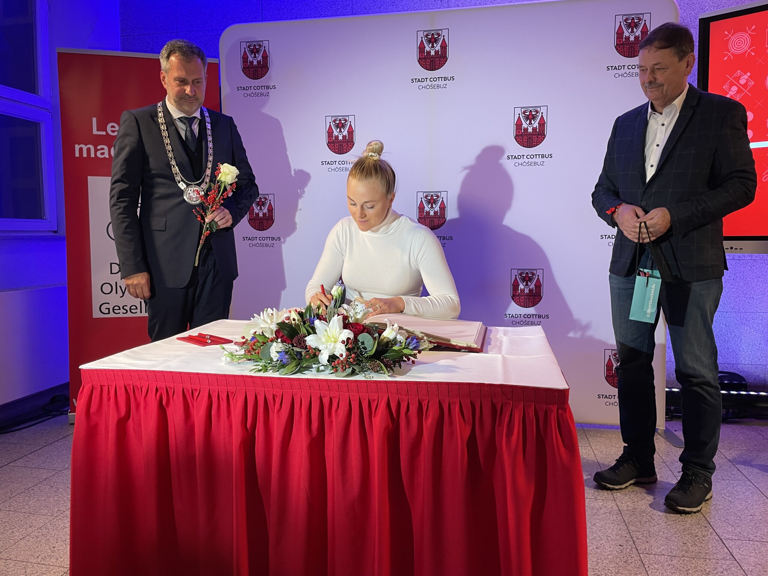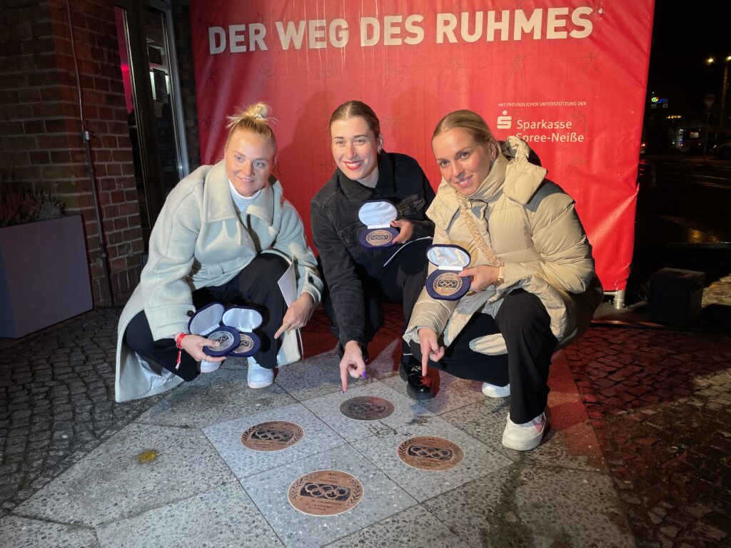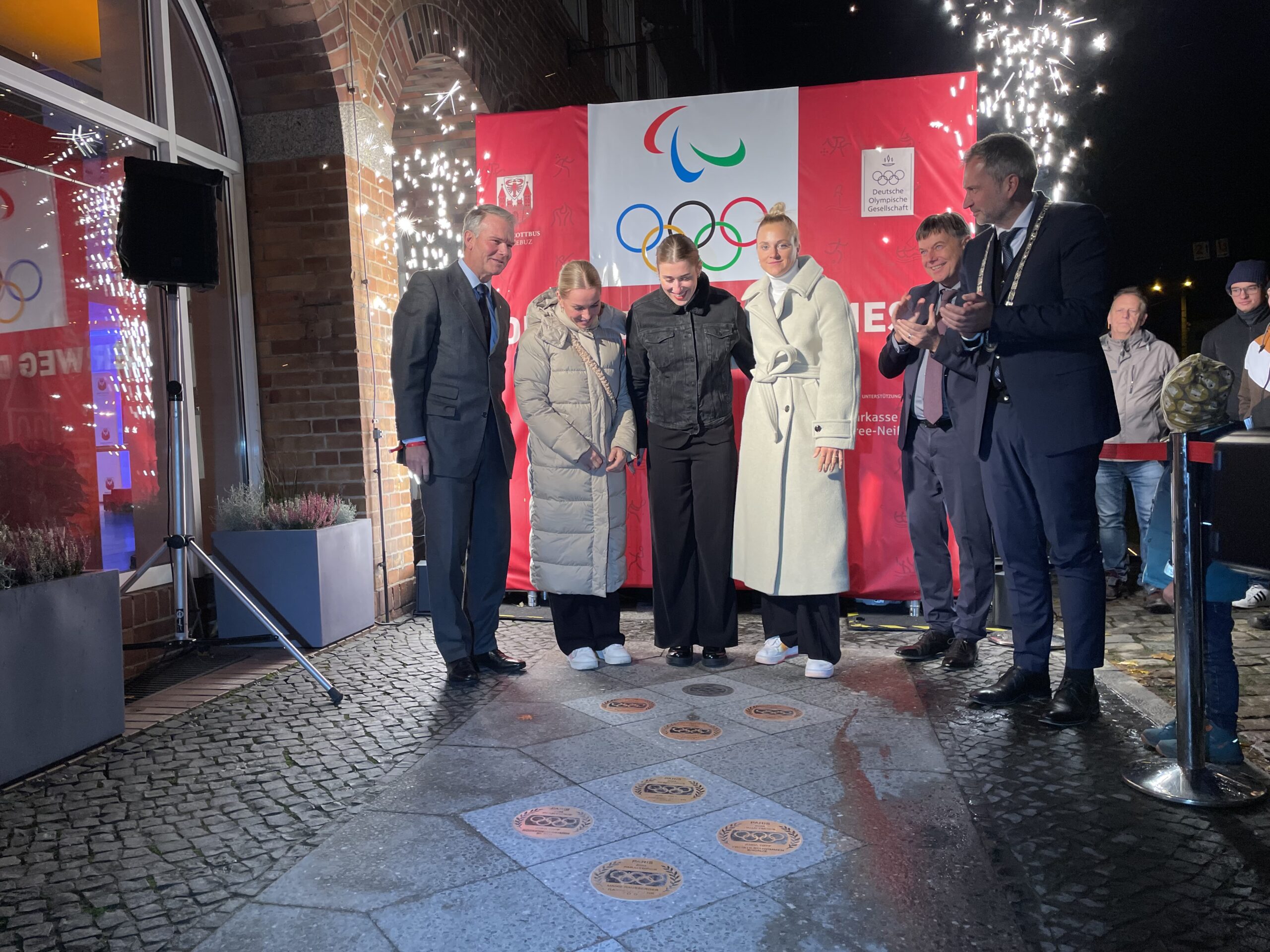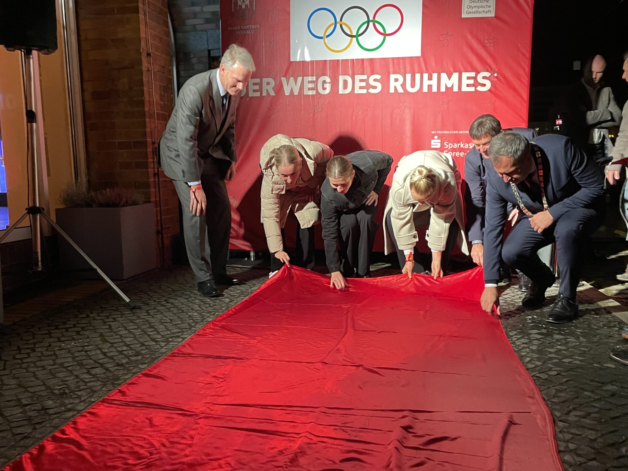 Auf Initiative der Deutschen Olympischen Gesellschaft Stadtgruppe Cottbus und mit Unterstützung der Sparkasse Spree-Neiße wurden 76 Plaketten in den Bürgersteig vor dem Cottbuser Rathaus eingelassen, die Einwohner und Besucher an die großen Leistungen der Cottbuser Olympioniken erinnern.