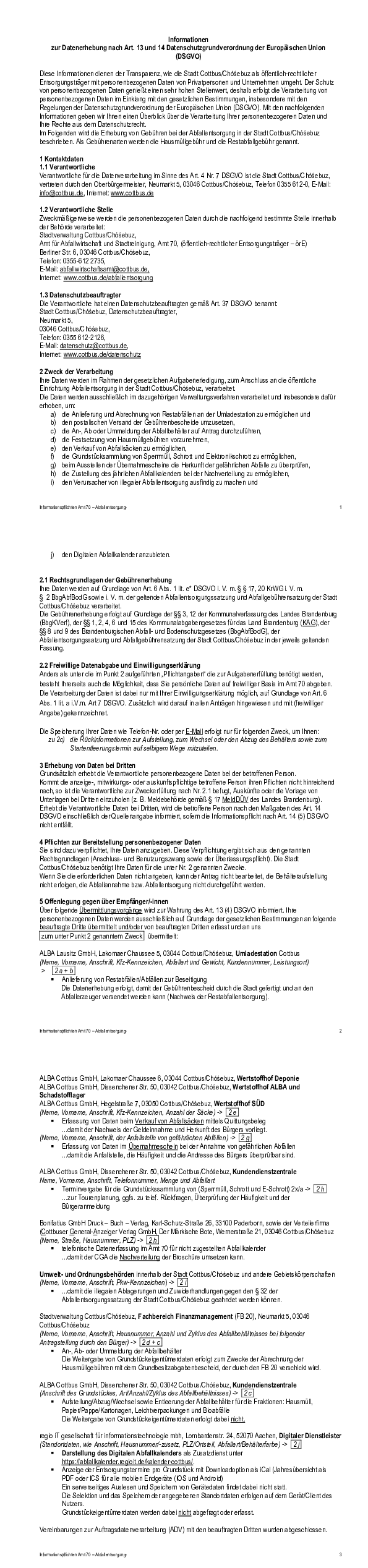 Diese Informationen dienen der Transparenz, wie die Stadt Cottbus/Chóśebuz als öffentlich-rechtlicher Entsorgungsträger mit personenbezogenen Daten von Privatpersonen und Unternehmen umgeht.