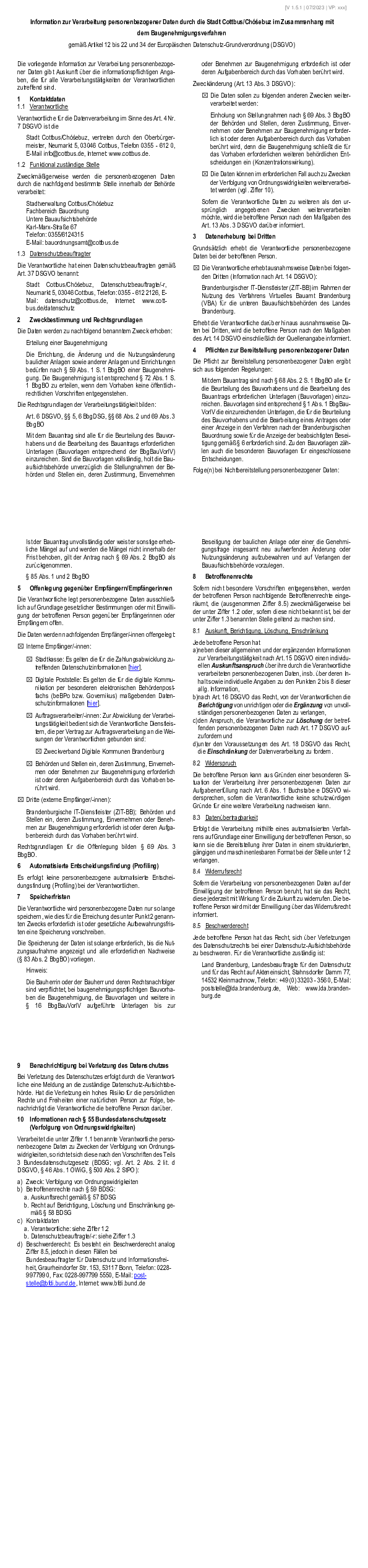 Information zur Verarbeitung personenbezogener Daten durch die Stadt Cottbus-Chóśebuz im Zusammenhang mit dem Baugenehmigungsverfahren