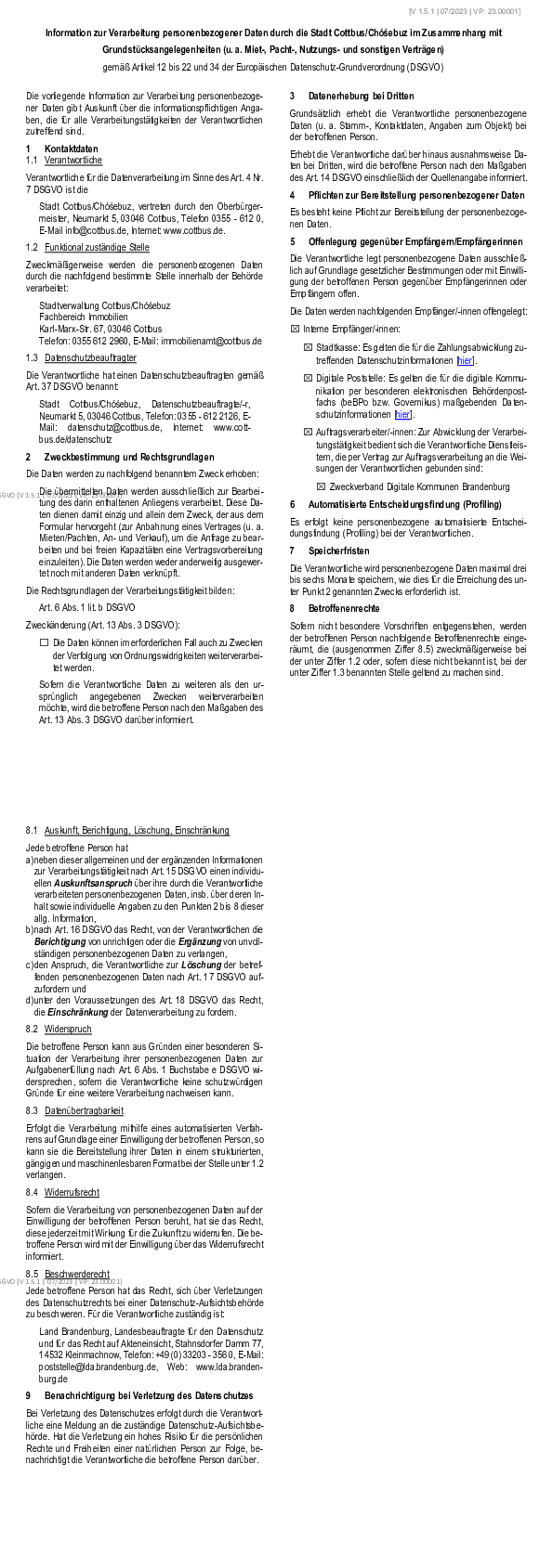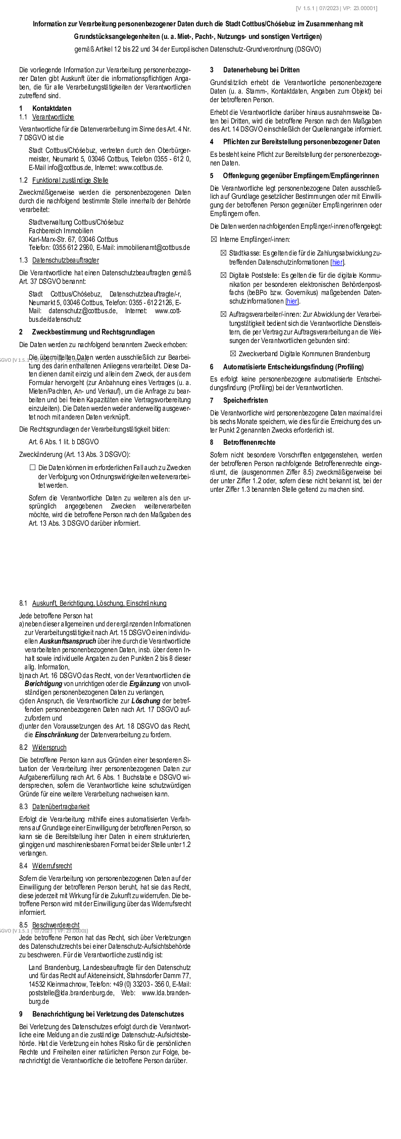 Information zur Verarbeitung personenbezogener Daten durch die Stadt Cottbus Chóśebuz im Zusammenhang mit Grundstücksangelegenheiten