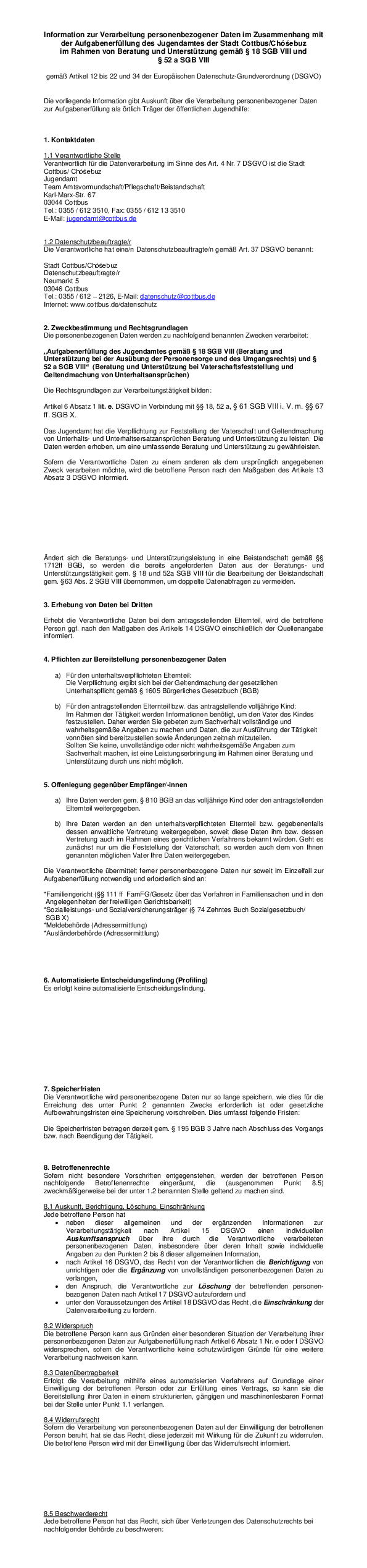 Information zur Verarbeitung personenbezogener Daten im Zusammenhang mit der Aufgabenerfüllung des Jugendamtes der Stadt Cottbus Chóśebuz im Rahmen von Beratung und Unterstützung gemäß § 18 SGB VIII und § 52 a SGB VIII