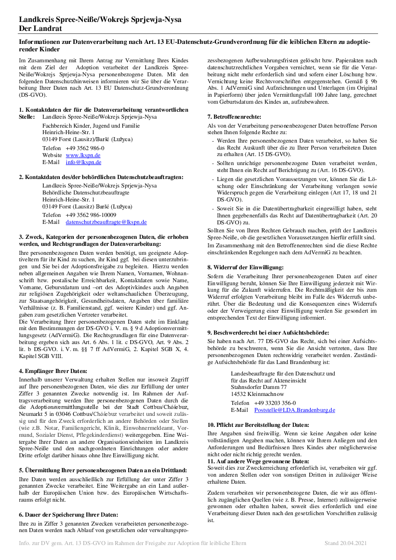 Im Zusammenhang mit Ihrem Antrag zur Vermittlung Ihres Kindes mit dem Ziel der Adoption verarbeitet der Landkreis Spree- Neiße/Wokrejs Sprjewja-Nysa personenbezogene Daten. Mit den folgenden Datenschutzhinweisen informieren wir Sie über die Verarbeitung Ihrer Daten nach Art. 13 EU Datenschutz-Grundverordnung (DS-GVO).