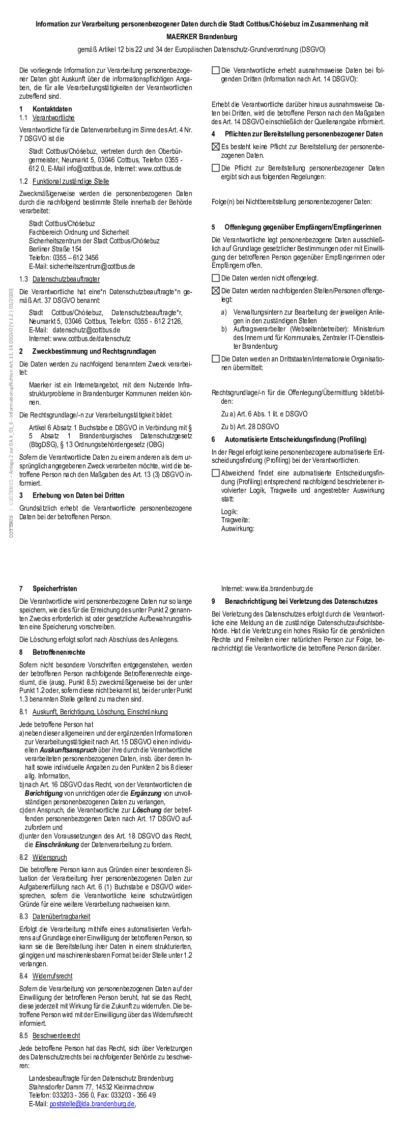 Information zur Verarbeitung personenbezogener Daten durch die Stadt Cottbus/Chóśebuz im Zusammenhang mit