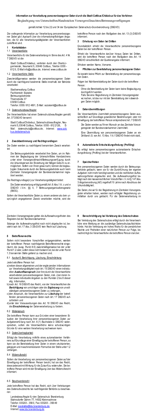 Information zur Verarbeitung personenbezogener Daten durch die Stadt Cottbus/Chóśebuz für das Verfahren