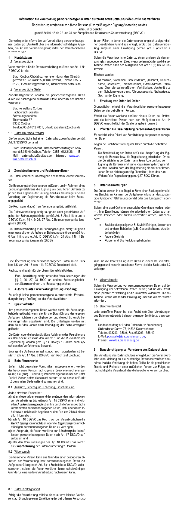 Information zur Verarbeitung personenbezogener Daten durch die Stadt Cottbus/Chóśebuz für das Verfahren