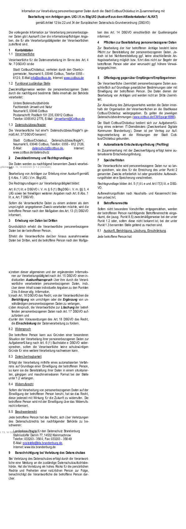 Information zur Verarbeitung personenbezogener Daten durch die Stadt Cottbus/Chóśebuz im Zusammenhang mit Bearbeitung von Anträgen gem. UIG i.V.m. BbgUIG (Auskunft aus dem Altlastenkataster/ ALKAT)