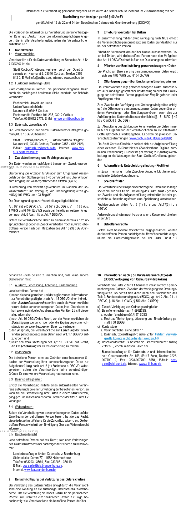Information zur Verarbeitung personenbezogener Daten durch die Stadt Cottbus/Chóśebuz im Zusammenhang mit der