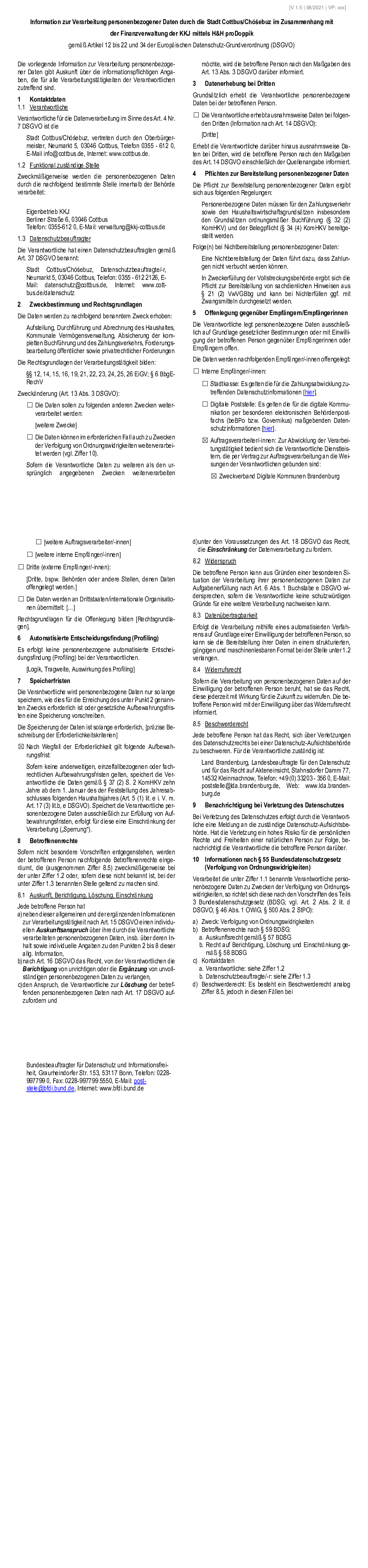 Information zur Verarbeitung personenbezogener Daten durch die Stadt Cottbus/Chóśebuz im Zusammenhang mit der Finanzverwaltung der KKJ mittels H & H proDoppik