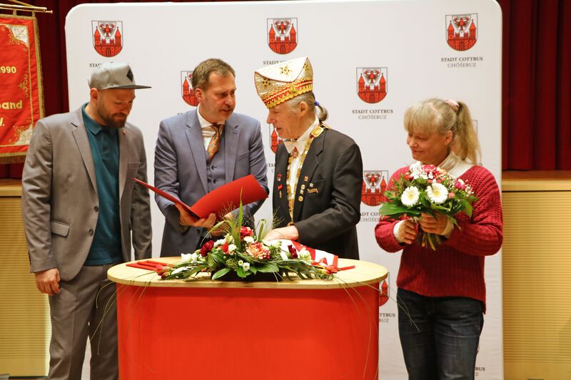 Die Stadt Cottbus/Chóśebuz bedankt sich bei Frank Czepok für seine außerordentlichen Verdienste um die Pflege und Erhaltung des karnevalistischen Brauchtums mit der Eintragung in die Ehrenchronik der Stadt Cottbus/Chóśebuz.