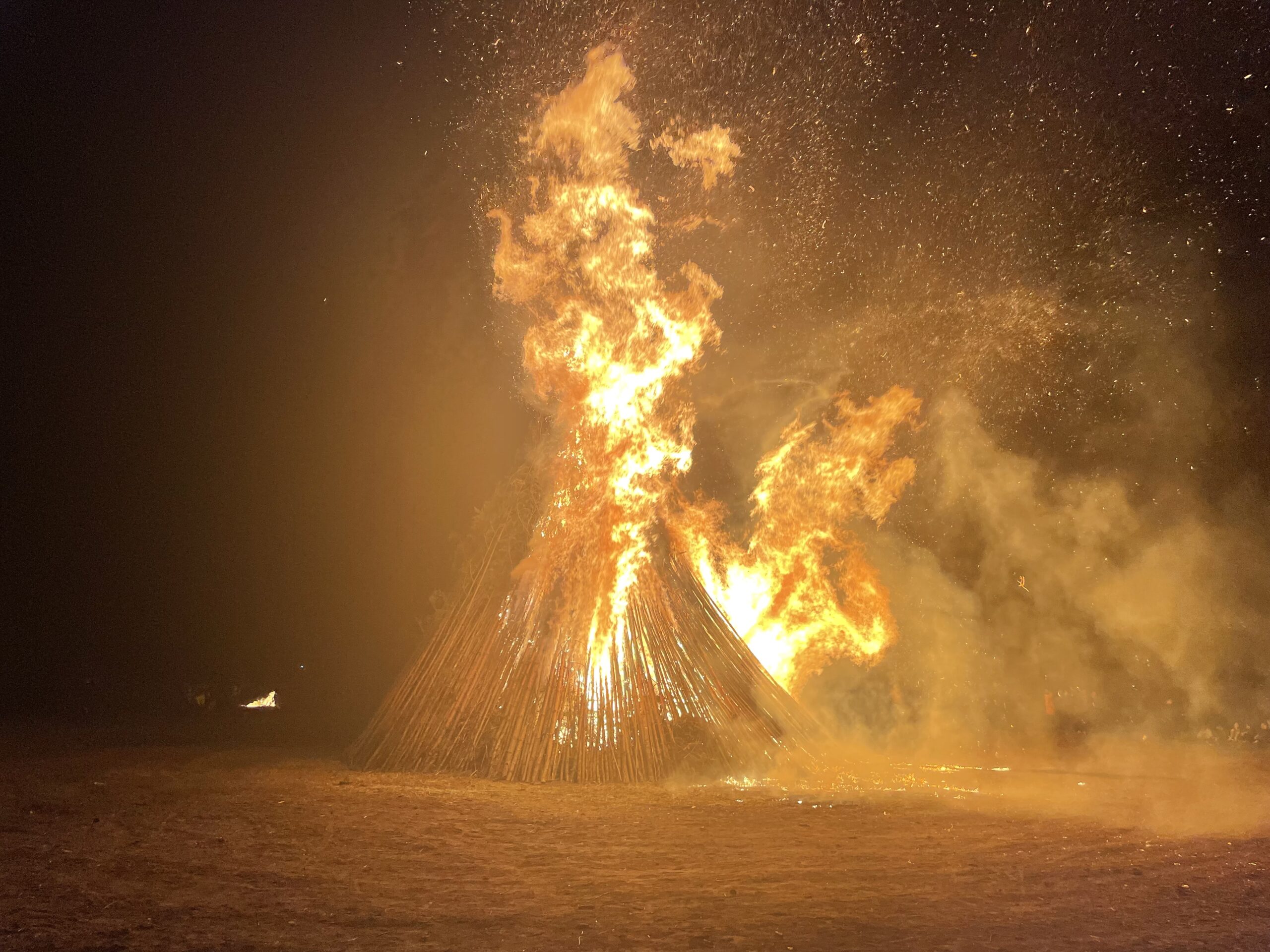Wo sich in Dorfnähe ein Hügel anbietet, wird dieser genutzt, denn soweit der Schein des Feuers leuchtet, soll das Land fruchtbar sein. Um Mitternacht wird das Feuer entzündet.