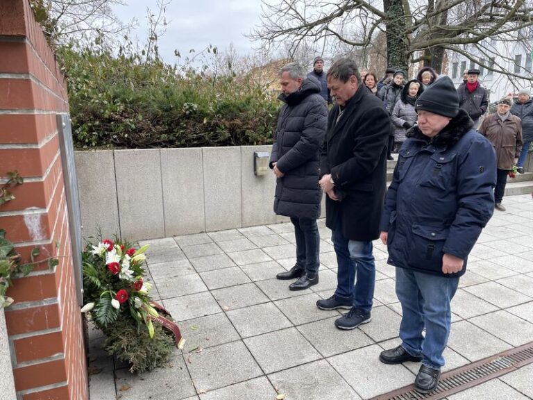 Stilles Erinnern am Holocaust-Gedenktag: In Cottbus/Chóśebuz haben Oberbürgermeister Tobias Schick und der Vorsitzende der Stadtverordnetenversammlung, Dr. Wolfgang Bialas, einen Kranz