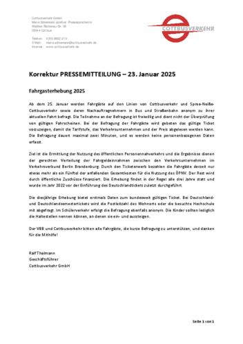 Pressemittellung der Cottbusverkehr GmbH: Fahrgasterhebung 2025