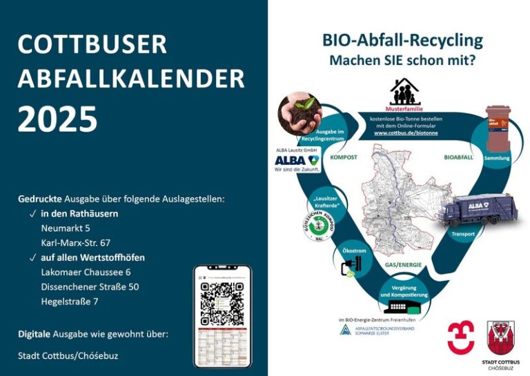 Der Cottbuser Abfallkalender für 2025 ist jetzt digital abrufbar. Die Versionen für Handy, Tablet oder PC sind freigeschaltet. Zu finden