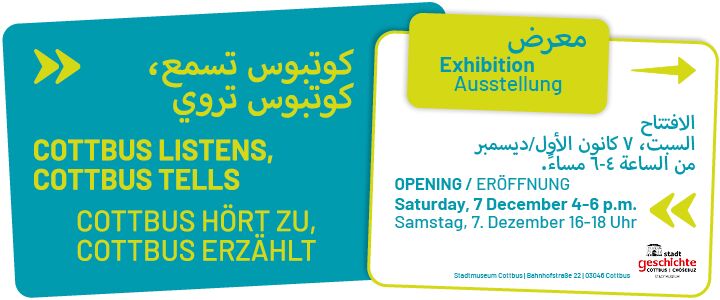Die Eröffnung der Ausstellung „Cottbus hört zu, Cottbus erzählt“ findet am Samstag, den 7. Dezember 2024, um 16:00 Uhr im