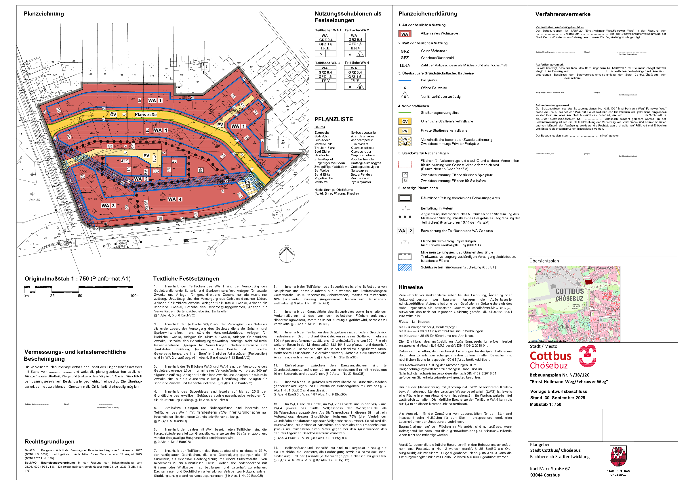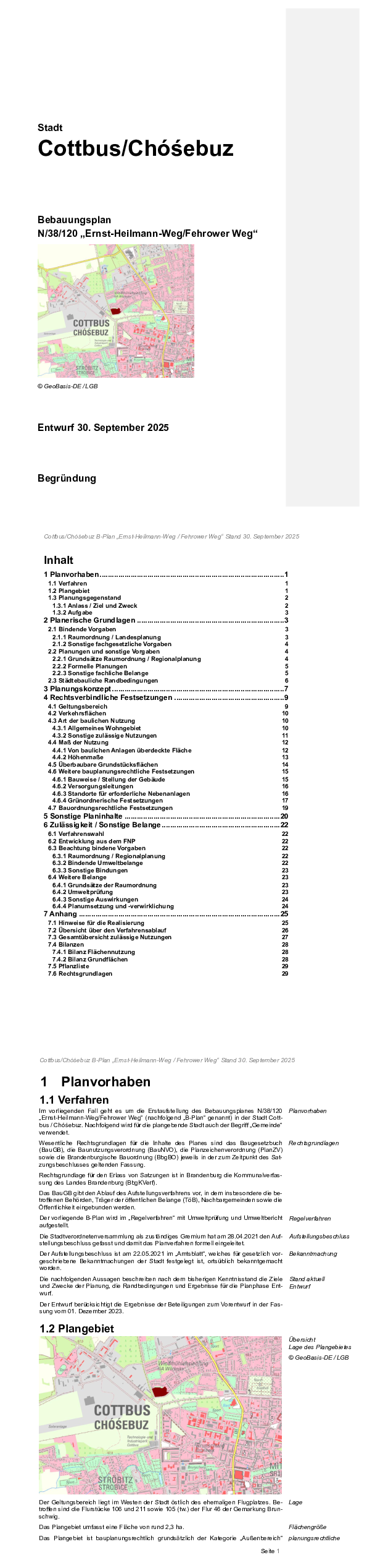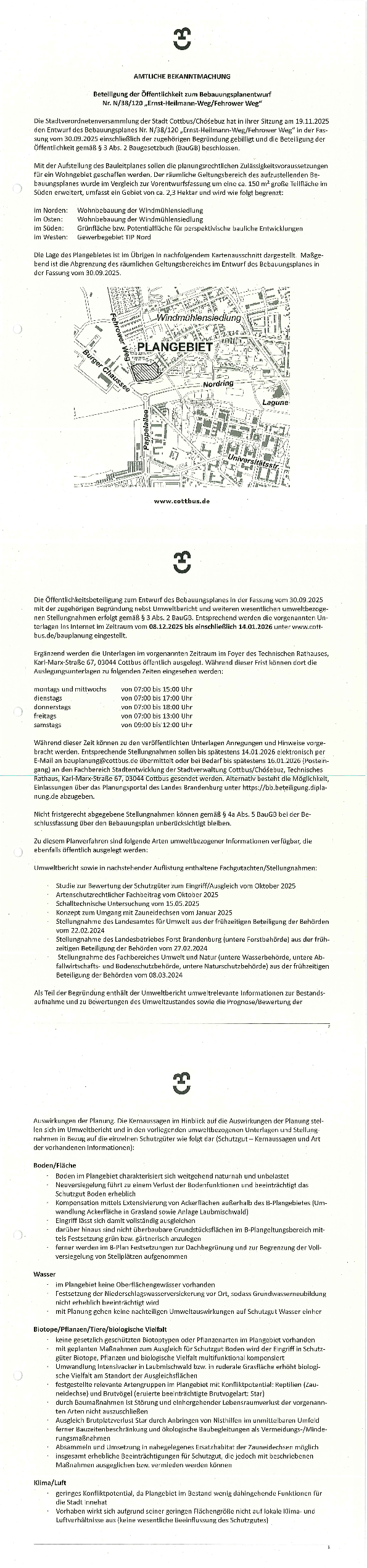 Die Stadtverordnetenversammlung der Stadt Cottbus/Chóśebuz hat in ihrer Sitzung am 19.11.2025 den Entwurf des Bebauungsplanes Nr. N/38/120 „Ernst-Heilmann-Weg/Fehrower Weg“ in der Fassung vom 30.09.2025 einschließlich der zugehörigen Begründung gebilligt und die Beteiligung der Öffentlichkeit gemäß § 3 Abs. 2 Baugesetzbuch (BauGB) beschlossen.