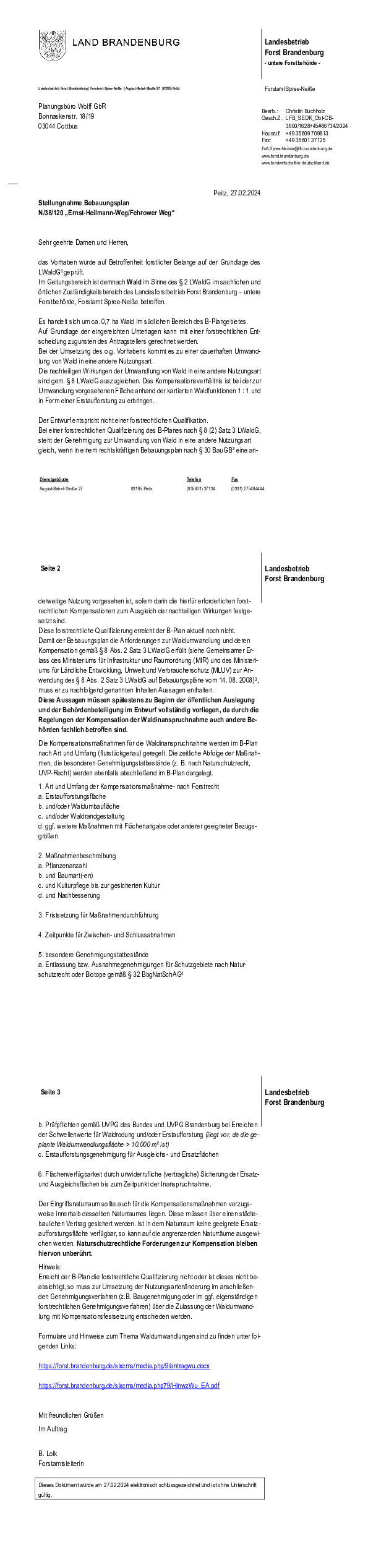 Die Verarbeitung personenbezogener Daten erfolgt auf Grundlage des § 3 BauGB in Verbindung mit Art. 6 Abs. 1 Buchst. e Datenschutz-Grundverordnung (DSGVO) und dem Brandenburgischen Datenschutzgesetz (BbgDSG). Sofern Sie Ihre Stellungnahme ohne Absender abgeben, erhalten Sie keine Mitteilung über das Ergebnis der Abwägung.