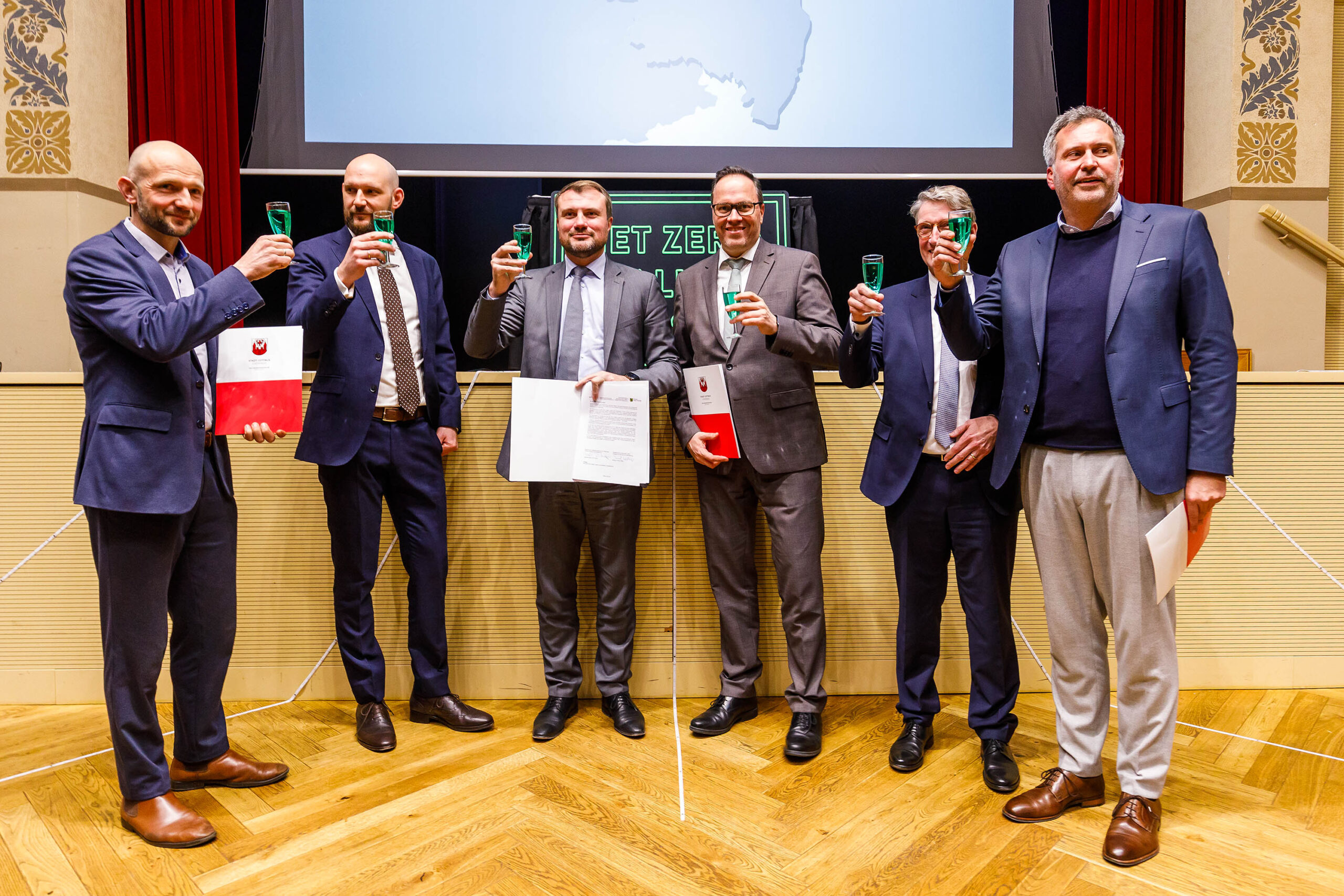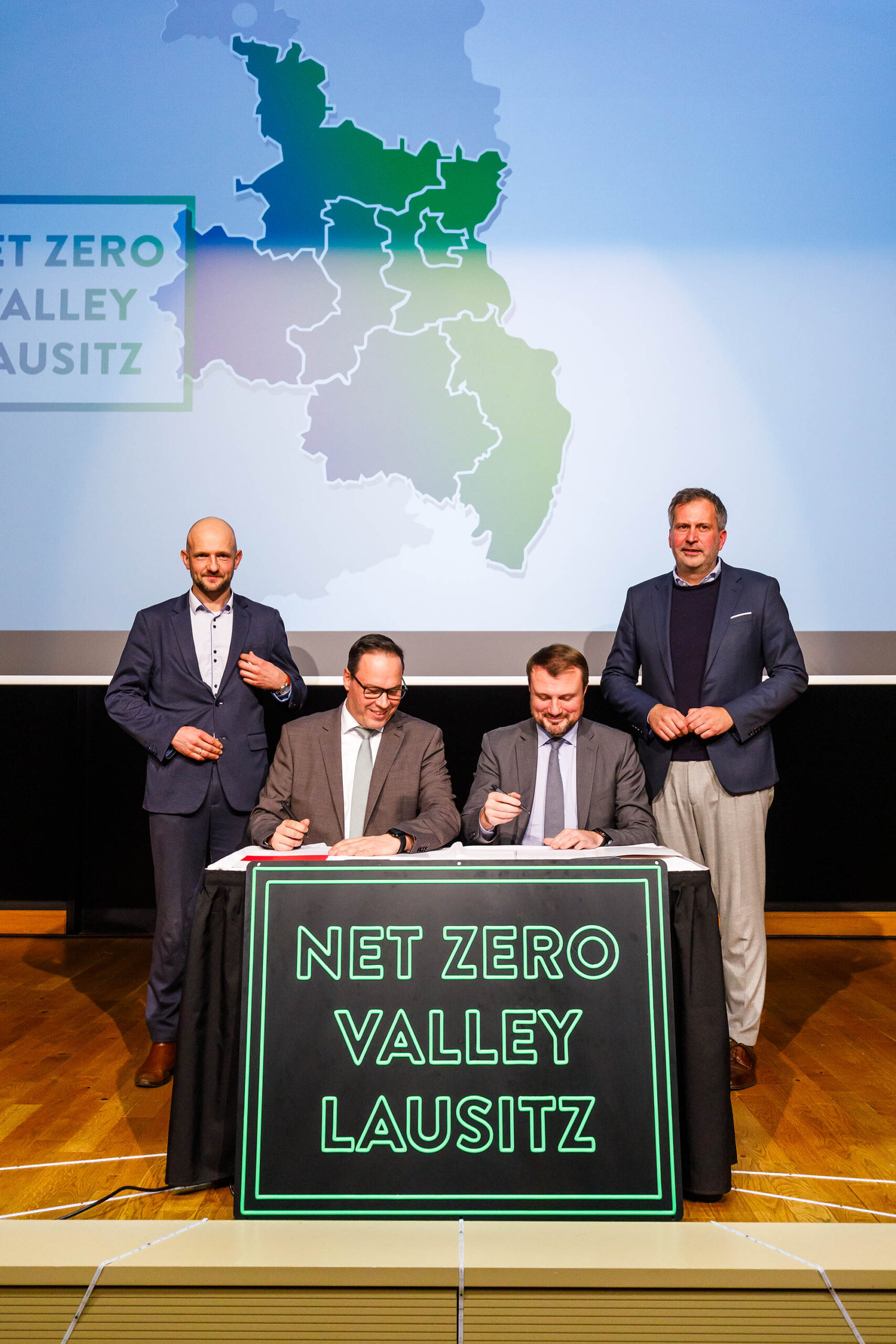 In Cottbus/Chóśebuz unterzeichneten heute die Wirtschaftsminister Brandenburgs und Sachsens, Daniel Keller und Dirk Panter, den Beschluss zur Ausweisung der Lausitz als europaweit erstes Net Zero Valley und übergaben den Beschluss stellvertretend für die mitwirkenden Akteure an den Oberbürgermeister der Stadt Cottbus/Chóśebuz, Tobias Schick und den Landrat des Landkreises Görlitz, Stephan Meyer.