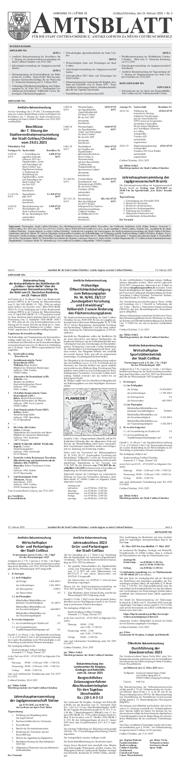 - Wahlbekanntmachung der Wahlbehörde Cottbus/ Chóśebuz – Wahl zum 21. Deutschen Bundestag am 23.2.2025