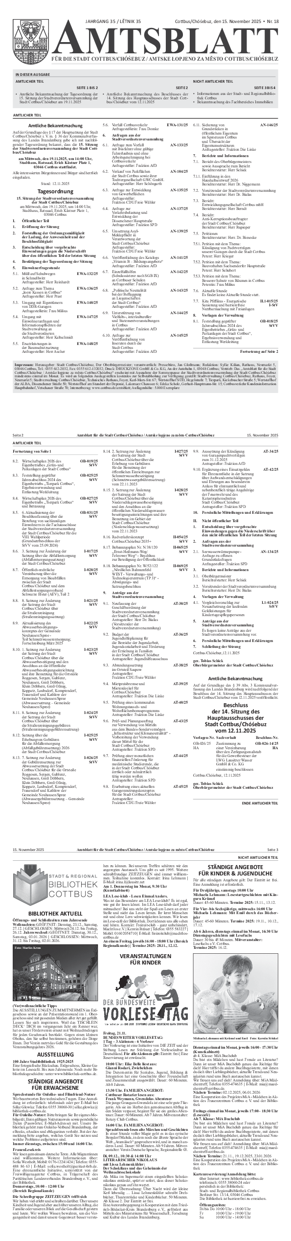 - Amtliche Bekanntmachung der Tagesordnung der 15. Sitzung der Stadtverordnetenversammlung der Stadt Cottbus/Chóśebuz am 19.11.2025