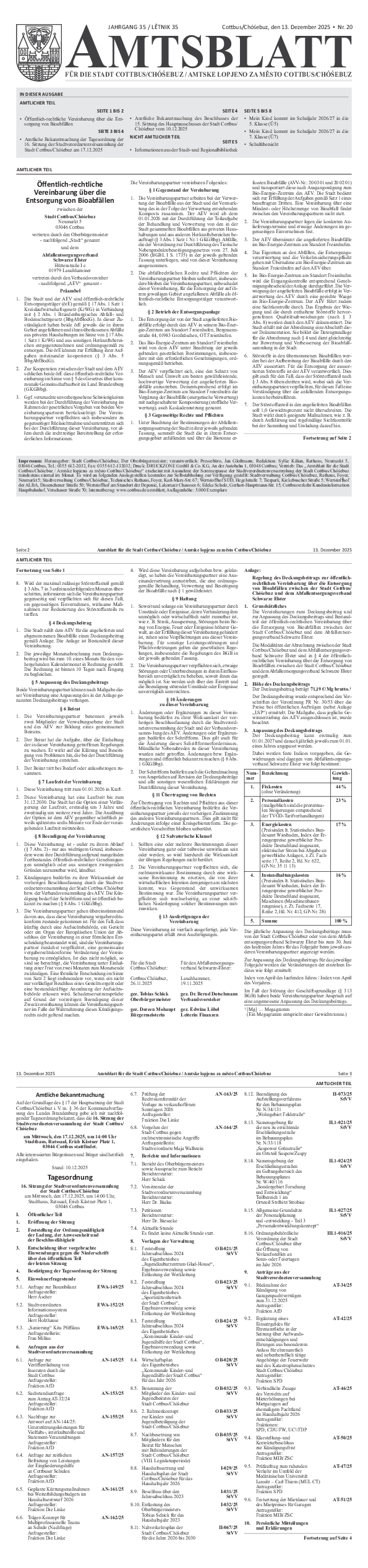 - Amtliche Bekanntmachung der Tagesordnung der 16. Sitzung der Stadtverordnetenversammlung der Stadt Cottbus/Chóśebuz am 17.12.2025