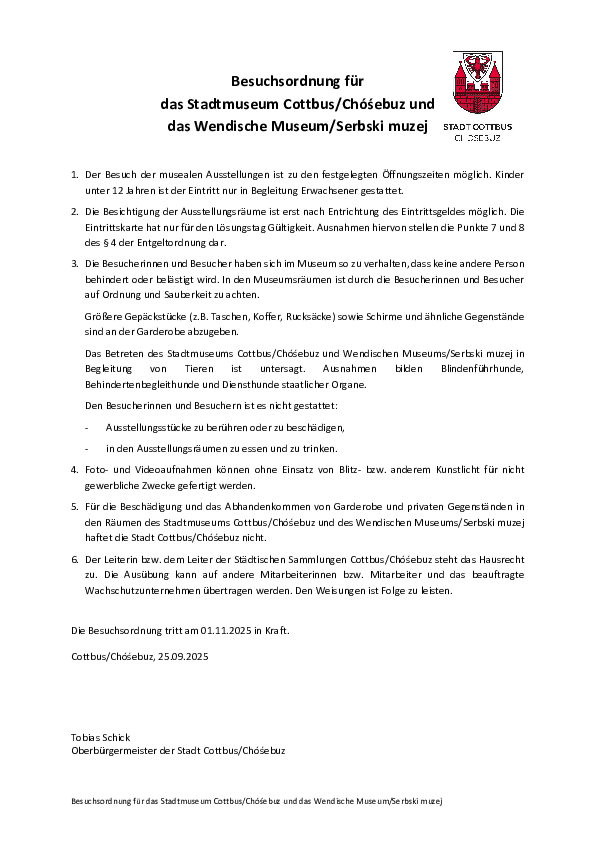 - Besuchsordnung für das Stadtmuseum Cottbus/Chóśebuz und das Wendische Museum/Serbski muzej