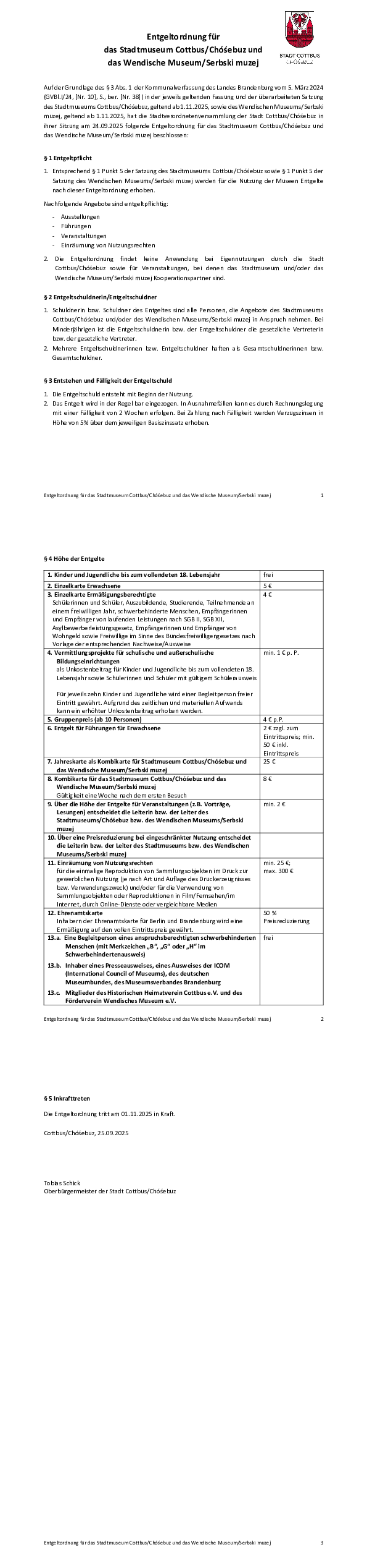 Entgeltordnung für das Stadtmuseum und das Wendische Museum
